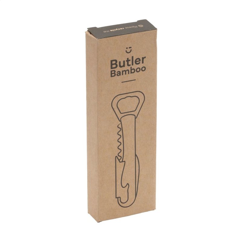Metalen, uitklapbaar kelnermes met bamboe greep en 4 functies: kurkentrekker, 2 flesopeners, loodsnijder. Per stuk in kraft doos.