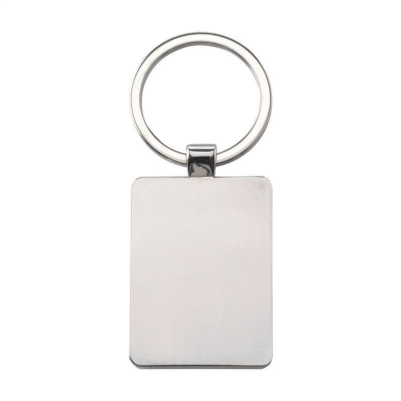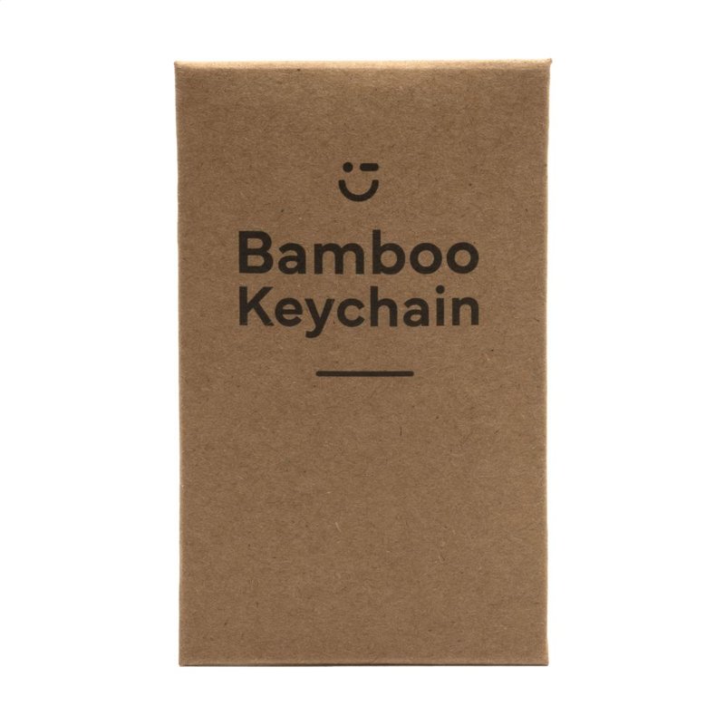 Rechthoekige, hoogglans, metalen sleutelhanger met bamboe houten inlay en stevige sleutelring. Duurzaam en verantwoord. Per stuk in kraft envelop.