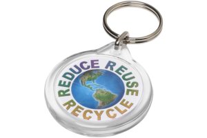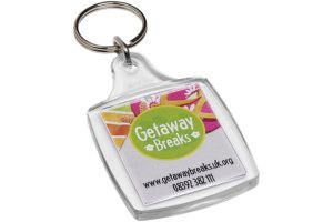 Doorzichtige R1 sleutelhanger met flesopener en metalen sleutelring. De metalen lusring biedt een vlak profiel dat ideaal is voor de post. Afmetingen van het te bedrukken inzetstuk: 4,0 cm x 3,2 cm.