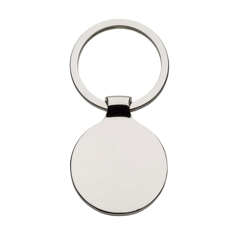 Ronde, hoogglans, nikkelen sleutelhanger met zwart metalen inlay en stevige sleutelring. Chic en exclusief. Per stuk in doosje.