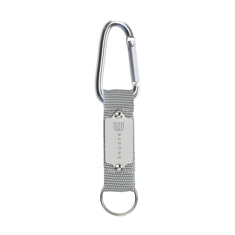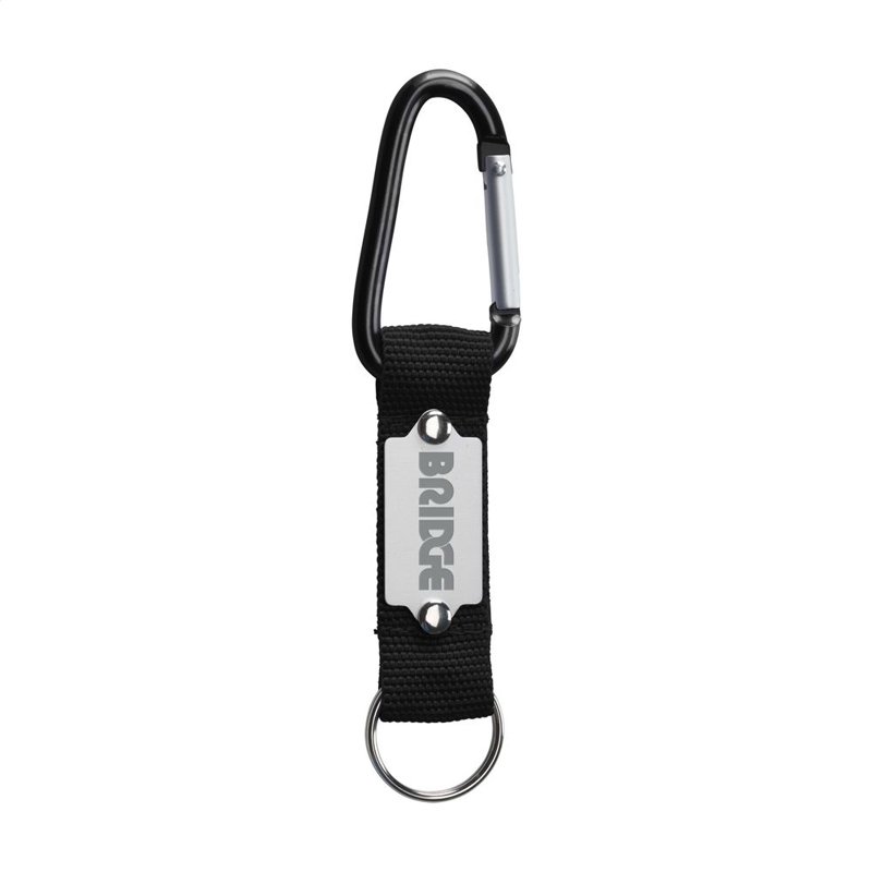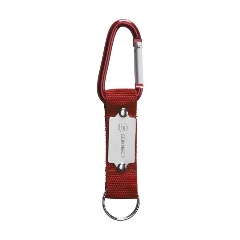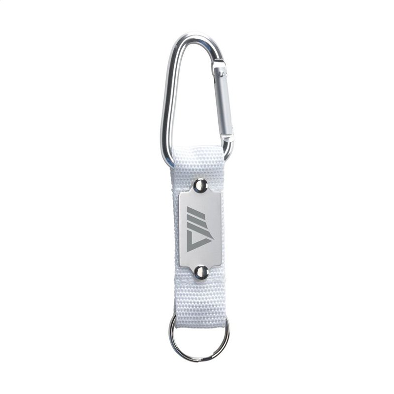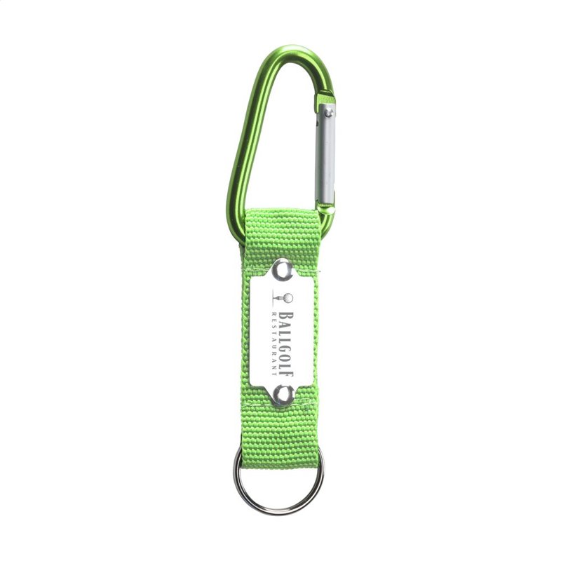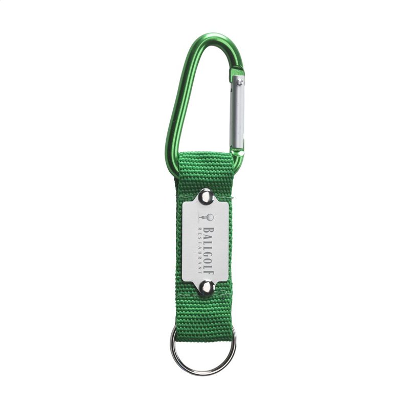 Handige karabijnhaak gecombineerd met een sterk geweven nylon aan een stevige sleutelring. Dit artikel is in een aantal verschillende kleuren verkrijgbaar en kan voorzien worden van een gravure op het metalen plaatje. Bedrukken van deze handige sleutelhanger is niet mogelijk i.v.m. duurzaamheid van het logo. Door gebruik aan bijvoorbeeld een sleutelbos zal de opdruk snel beschadigen.