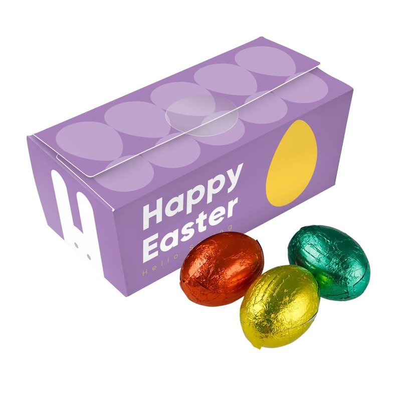 Ballotin doosje voorzien van een all-over full colour bedrukking en gevuld met ca. 150 gram Crispy Paaseitjes