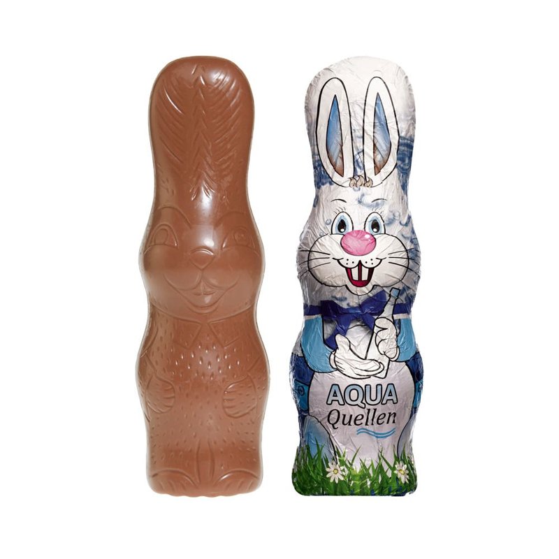 Maxi melkchocolade paashaas van ca. 40 gram in aluminiumfolie folie, voorzien van een all-over full colour bedrukking