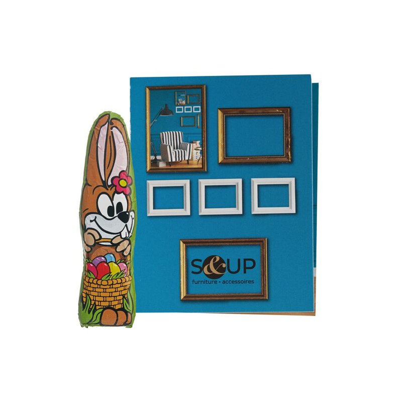 Bedrukte kaart met standaard mini chocolade paashaasje van ca. 6 gram in aluminiumfolie folie, voorzien van een all-over full colour bedrukking