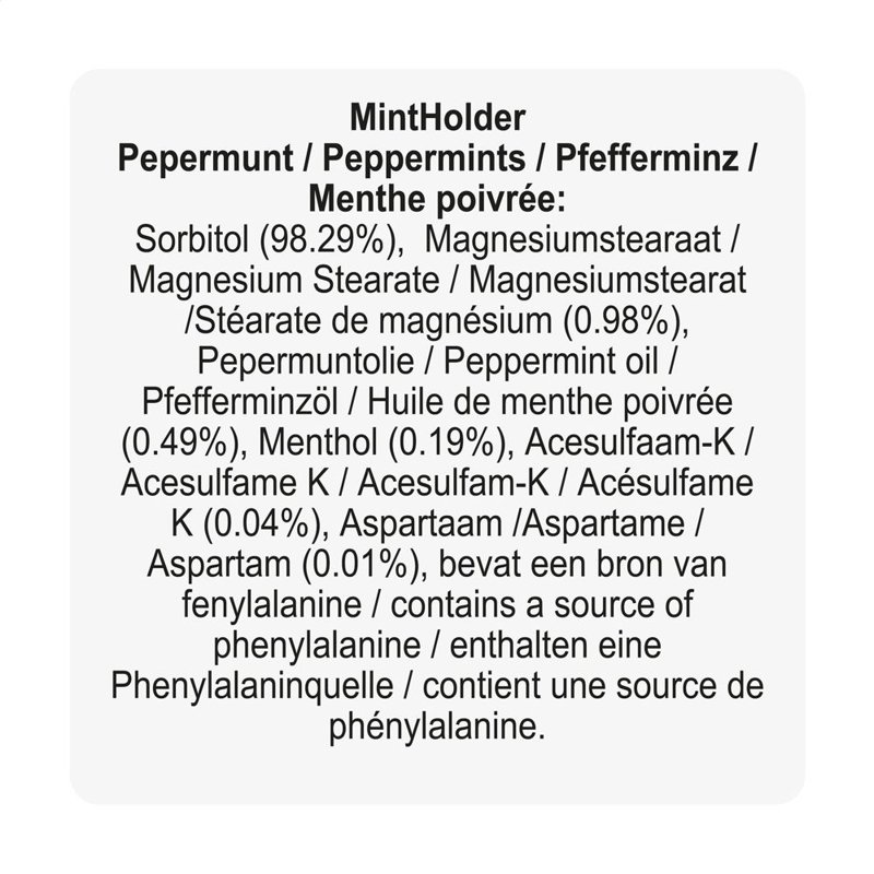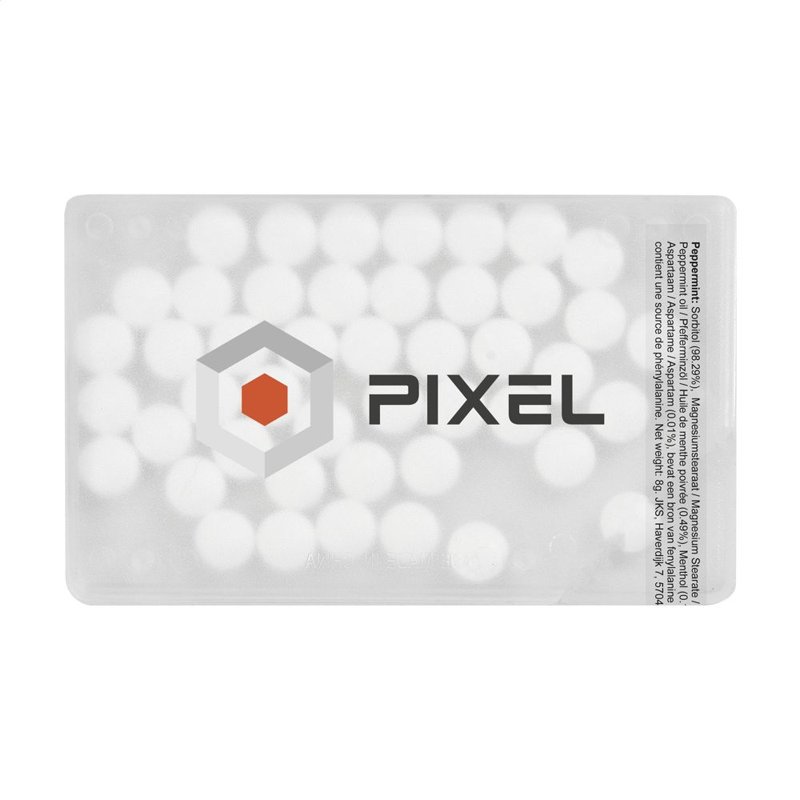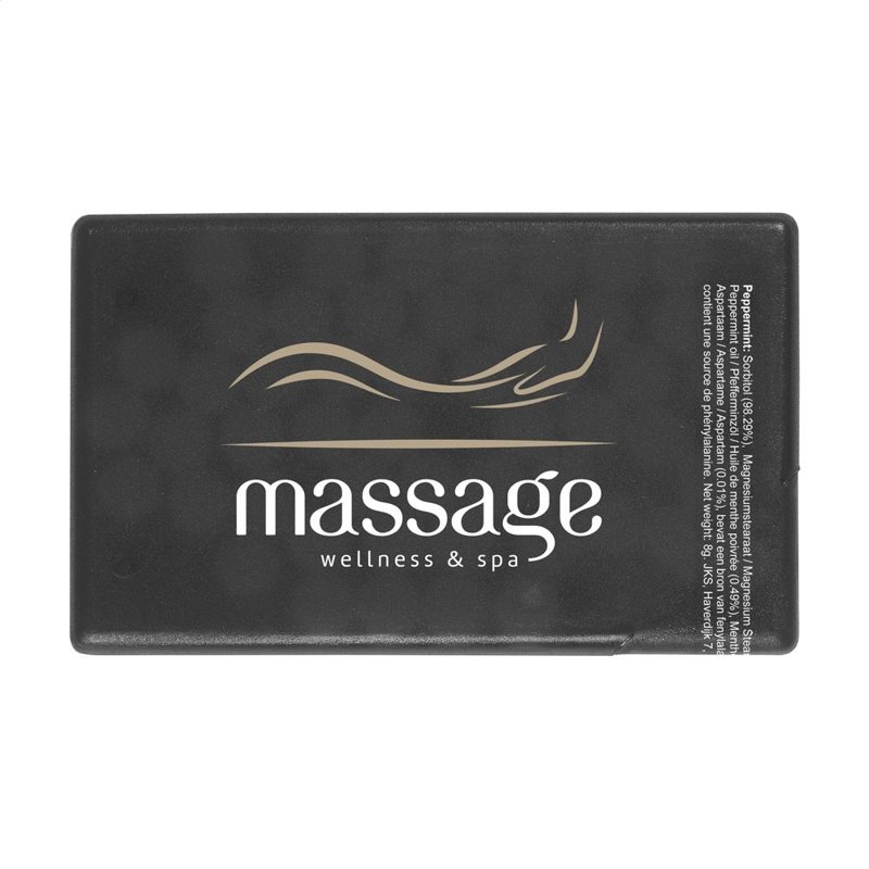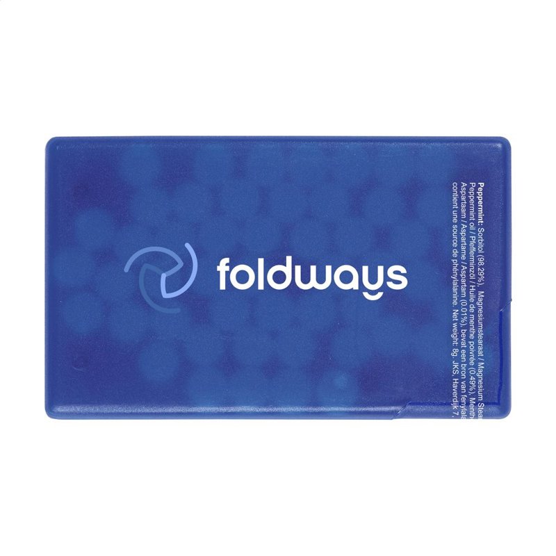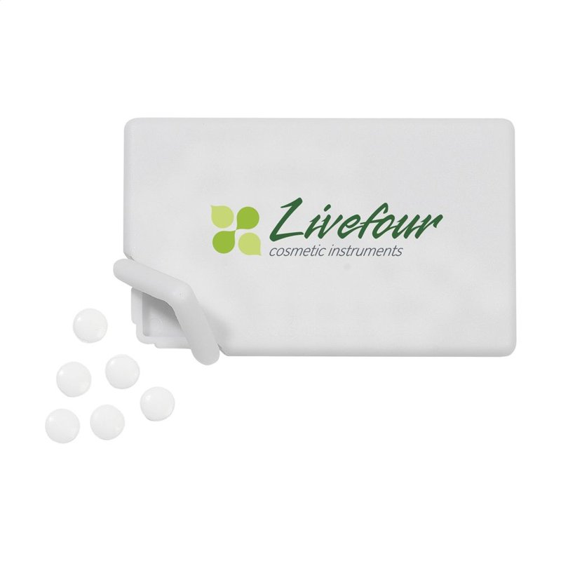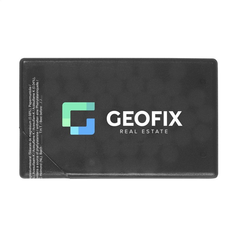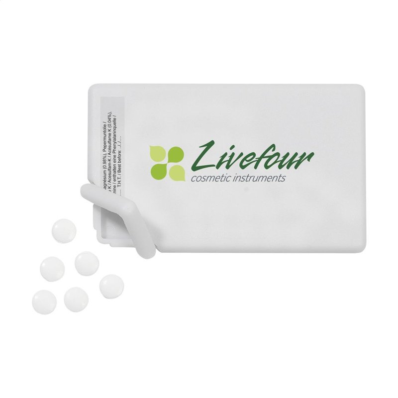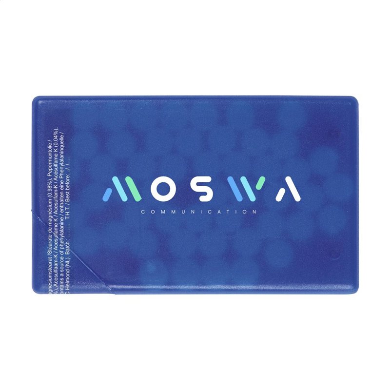 Uw logo bedrukt op deze pepermunthouder? Vraag een vrijblijvende offerte aan voor de creditcard dispenser met ca. 50 suikervrije pepermuntjes.