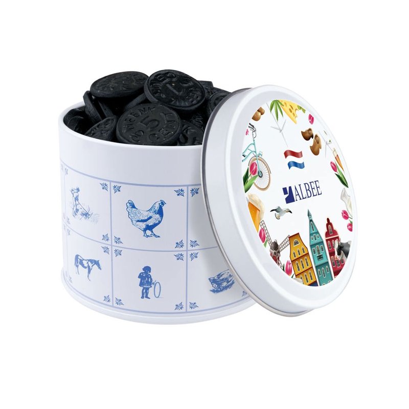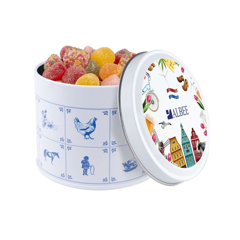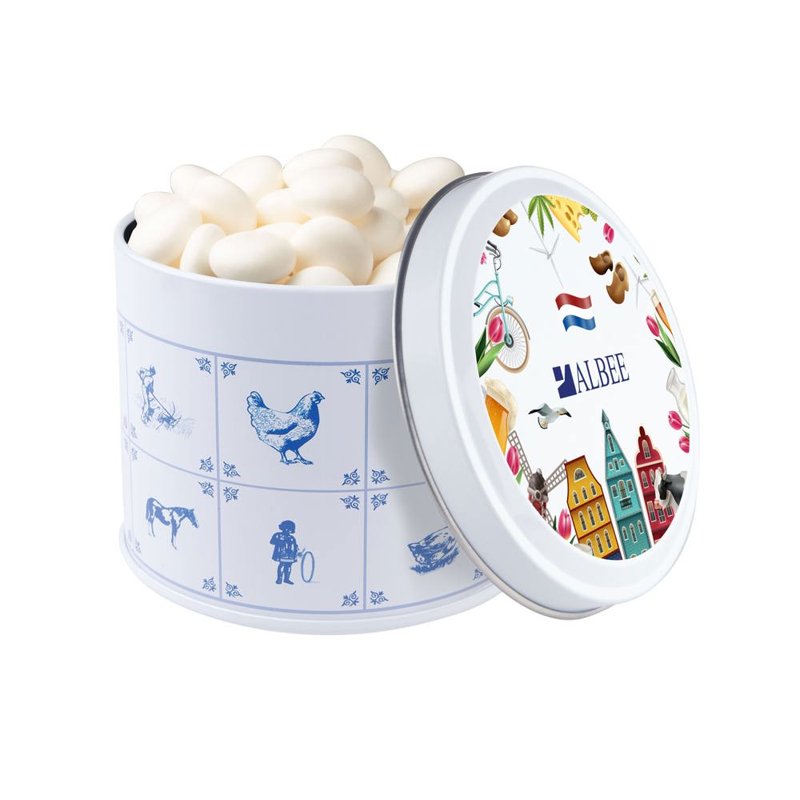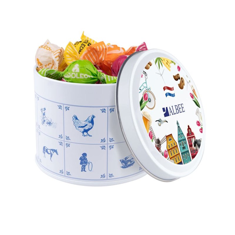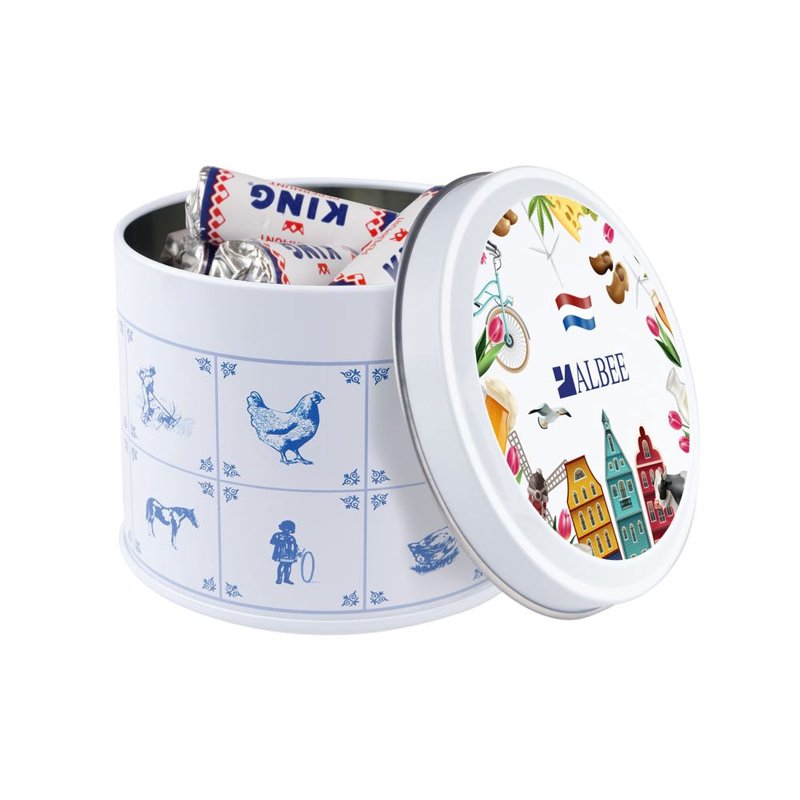 Delftsblauw blik gevuld met ca.28 standaard rolletjes KING pepermunt en voorzien van een full colour digitale bedrukking op het deksel