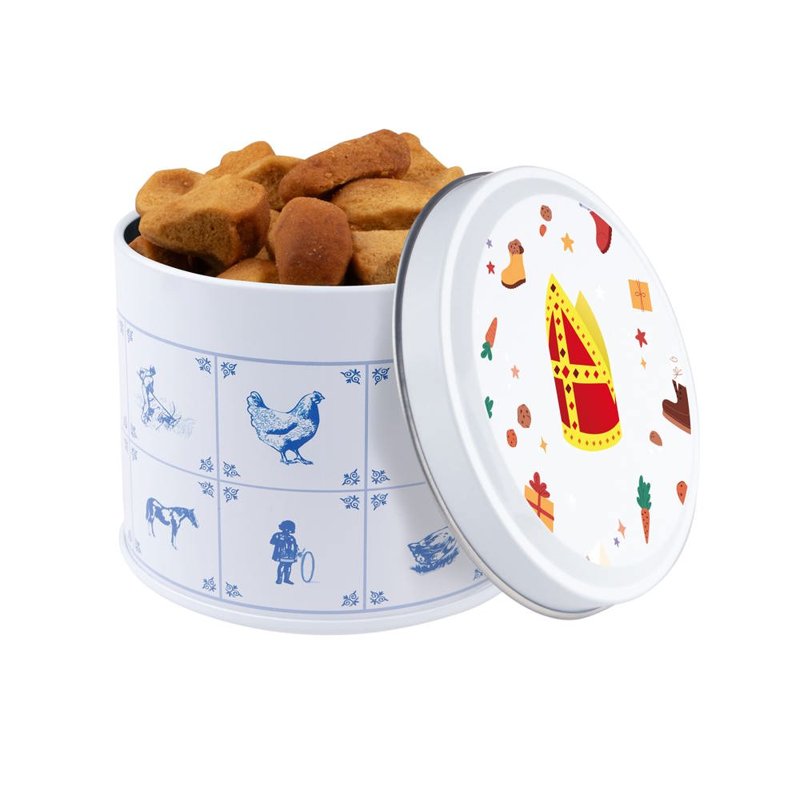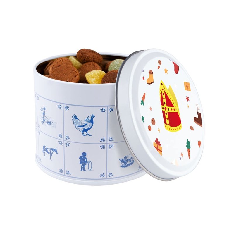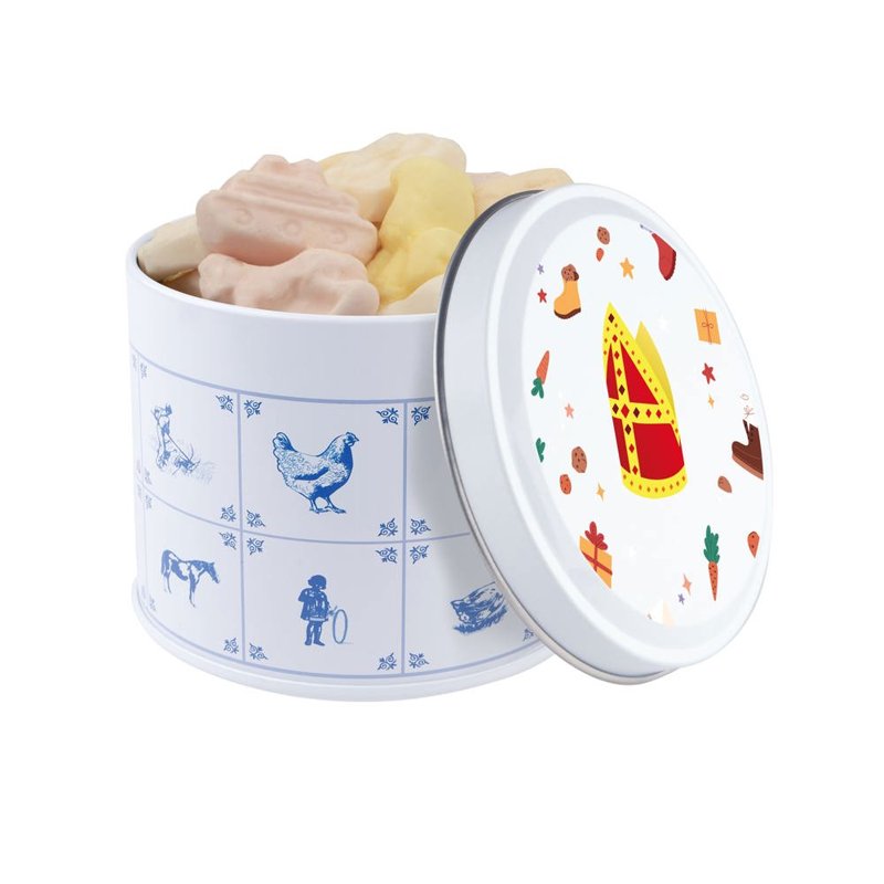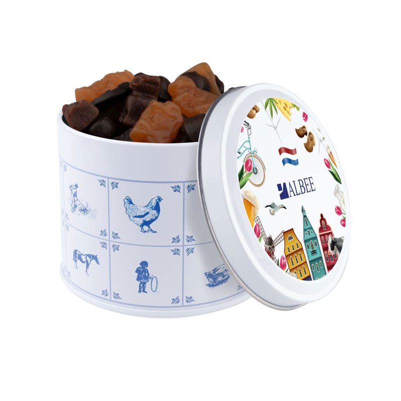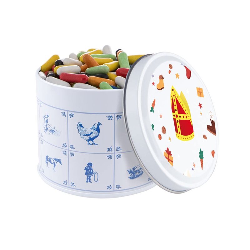 Delftsblauw blik gevuld met ca.28 standaard rolletjes KING pepermunt en voorzien van een full colour digitale bedrukking op het deksel