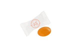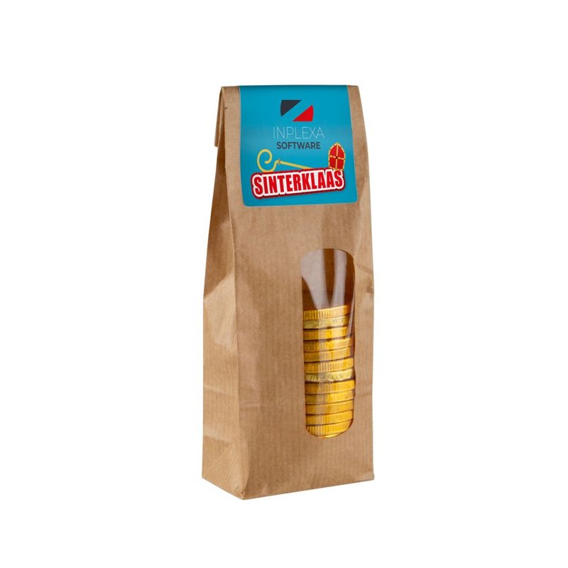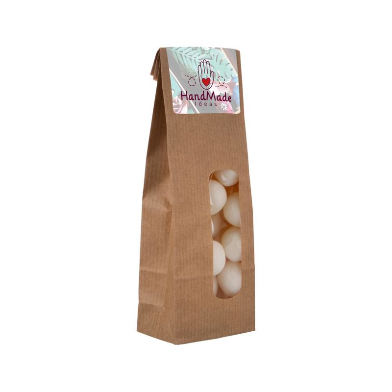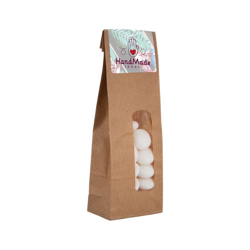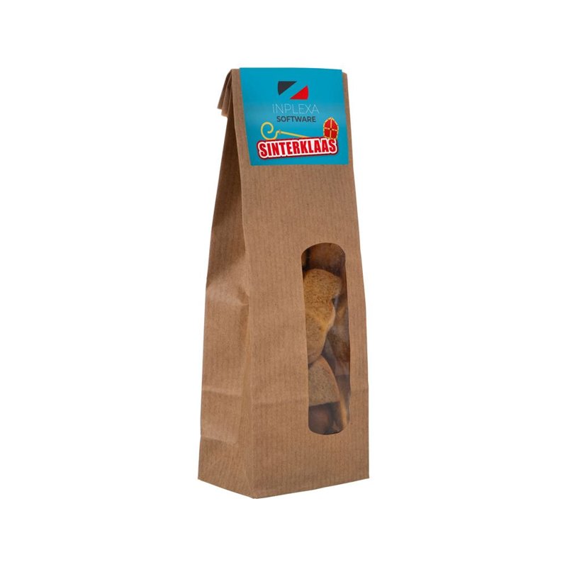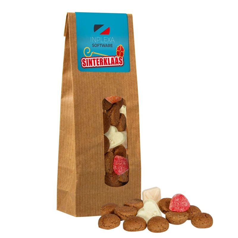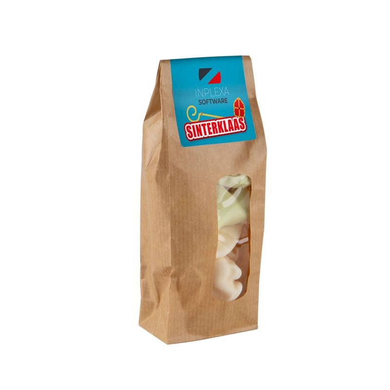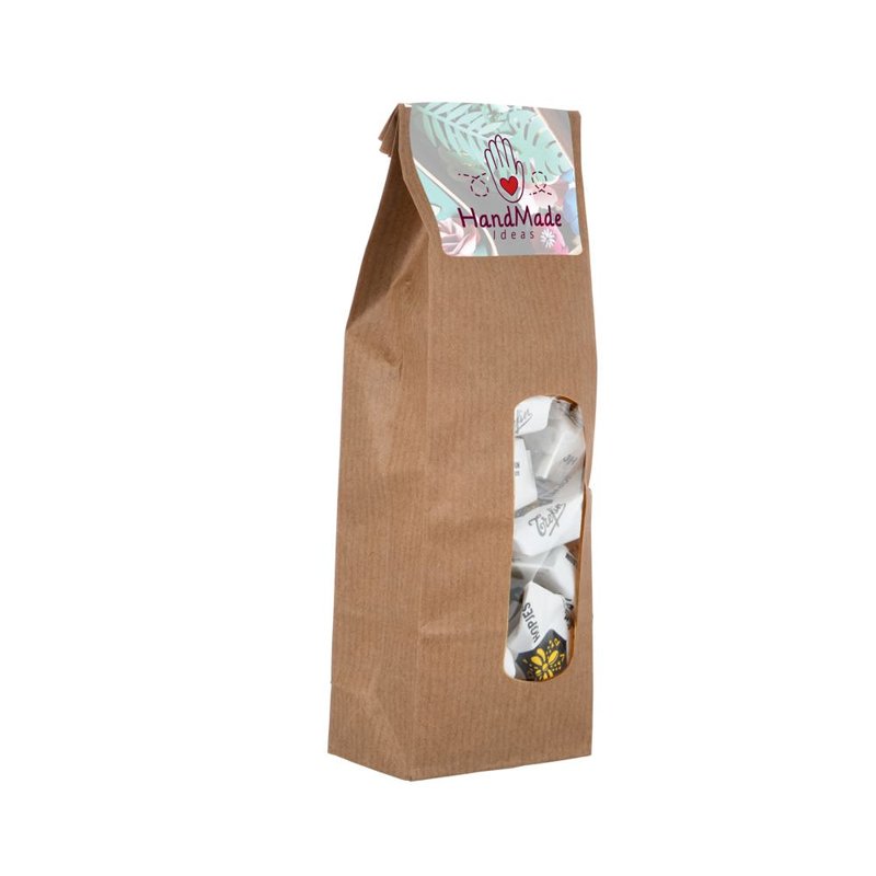 Kraft blokzakje met sticker, gevuld met 100 gram snoep