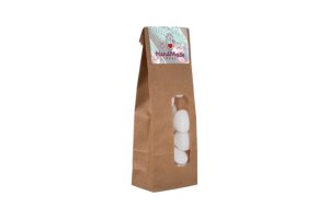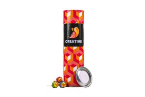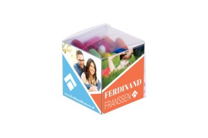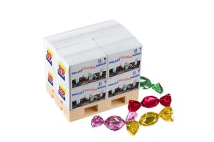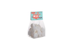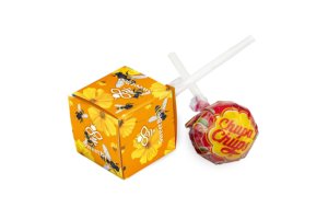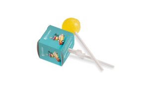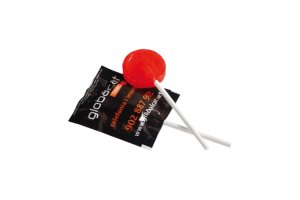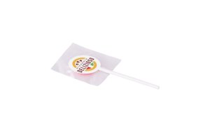 Ronde lolly van ca. 13 gram in witte folie, voorzien van een all-over bedrukking. Keuze uit diverse fruitsmaken.