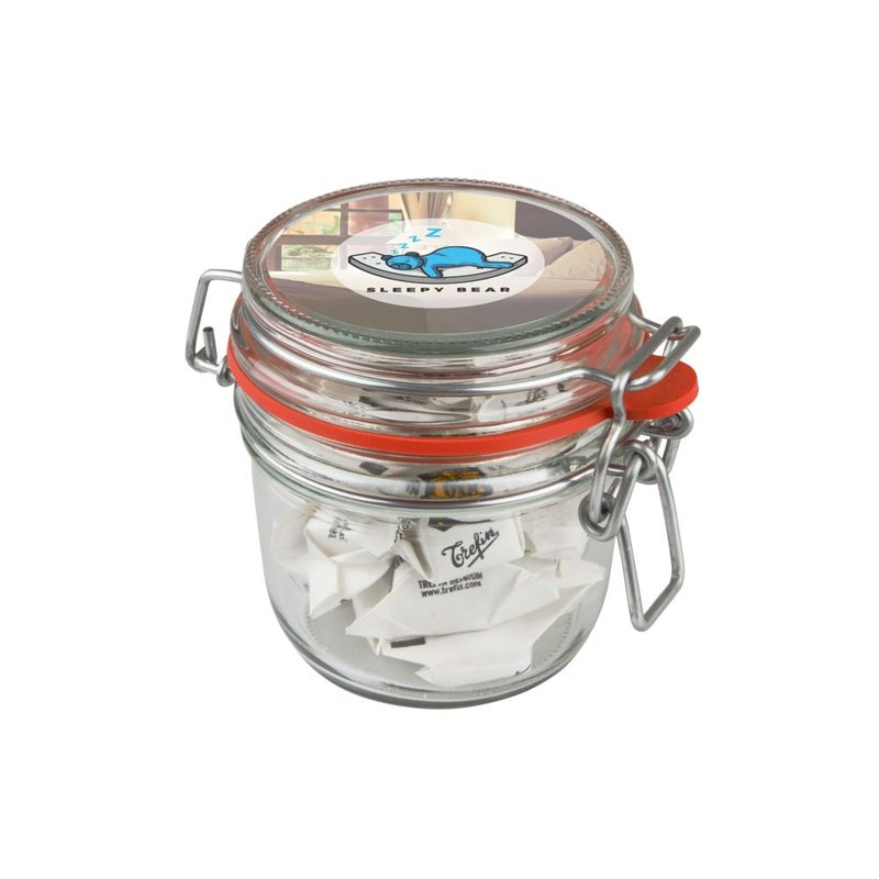 Weckpotje 0,25 liter met 1 full colour sticker op het deksel, gevuld met snoep