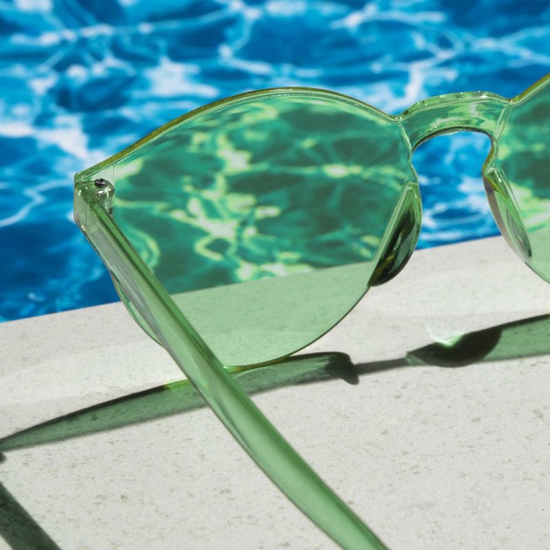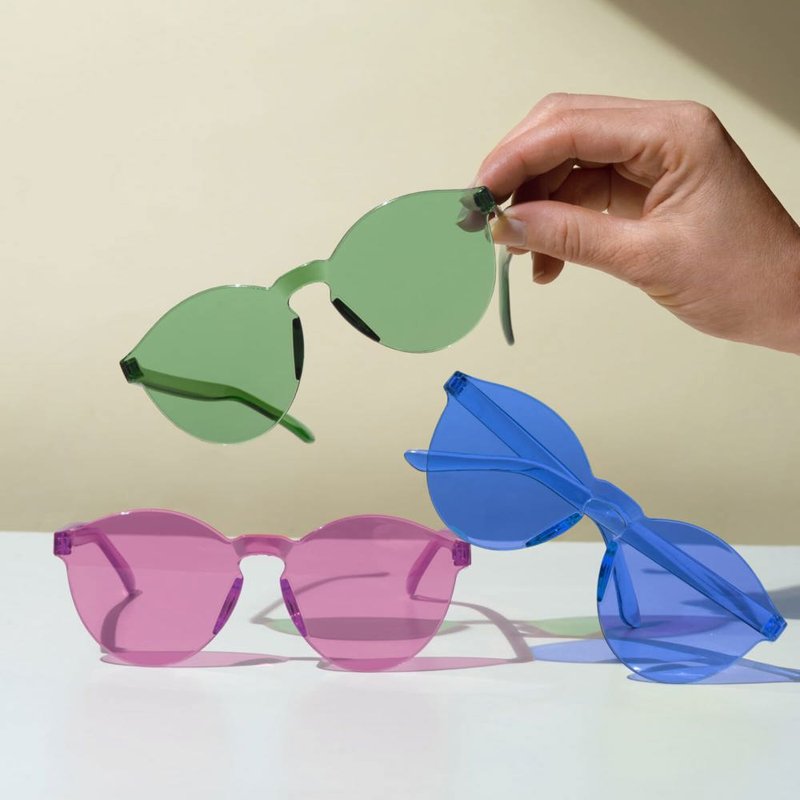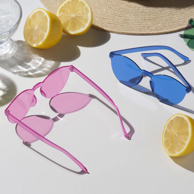 Vrolijke retrostijl zonnebril met uniform pastelkleurig frame en lenzen. De lenzen hebben een UV400 filter.