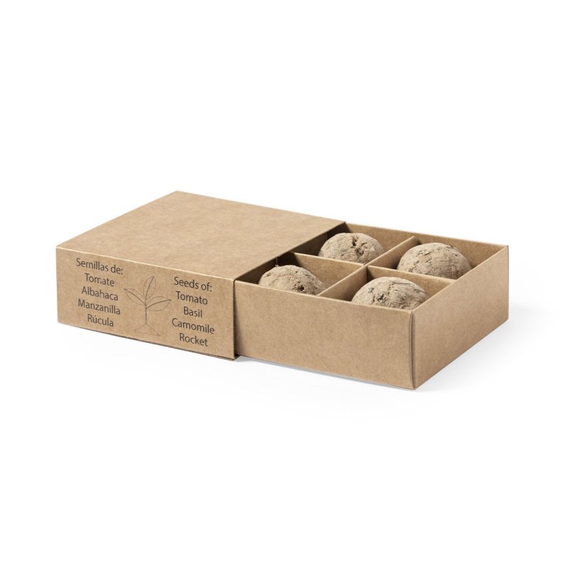Groentetuinset met tomaten-, basilicum-, rucola- en kamillezaad. Gepresenteerd in een gerecycled kartonnen doos met plantinstructies, Made in Europe embleem en met 4 onafhankelijke compartimenten. 4 Stuks Groententuin Kit Tomarux 2641