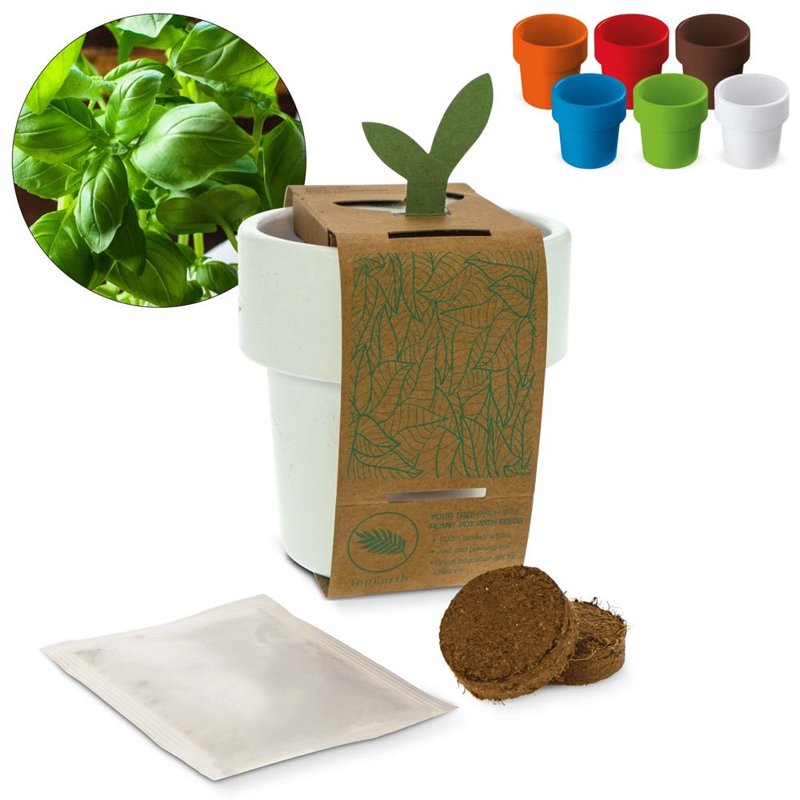 Een bloempotje met een pakje basilicum zaadjes in meerdere vrolijk kleuren. Als het plantje groot genoeg is om deze over te zetten in de tuin, dan is de bloempot tevens ook schoon te maken en te gebruiken als koffiemok. De goed ontworpen rand zorgt voor een dubbele wand, om te voorkomen dat de hand verbrand bij het drinken.