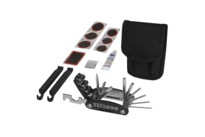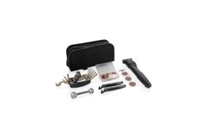 Fietsreparatieset in zakformaat die door zijn kleine formaat gemakkelijk mee te nemen is. De behuizing is gemaakt van PP-materiaal. De set bevat 1 aluminium sleutel, 2 bandenlichters, 1 tube lijm, 2 ventieldopjes, 2 ventielbuizen, 1 rasp, 5 reparatiepatches.