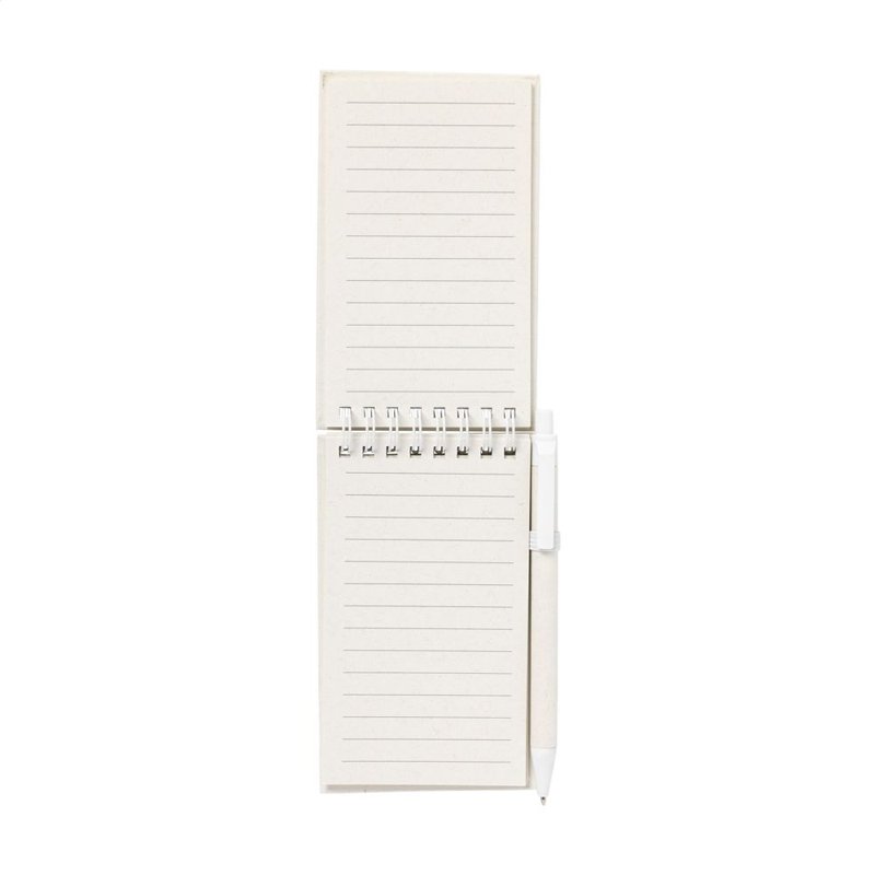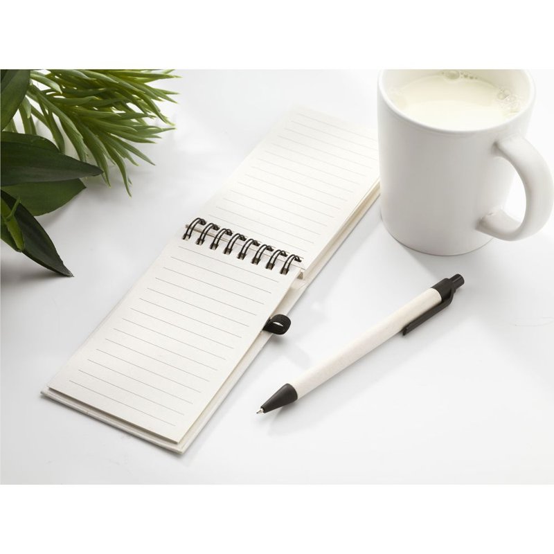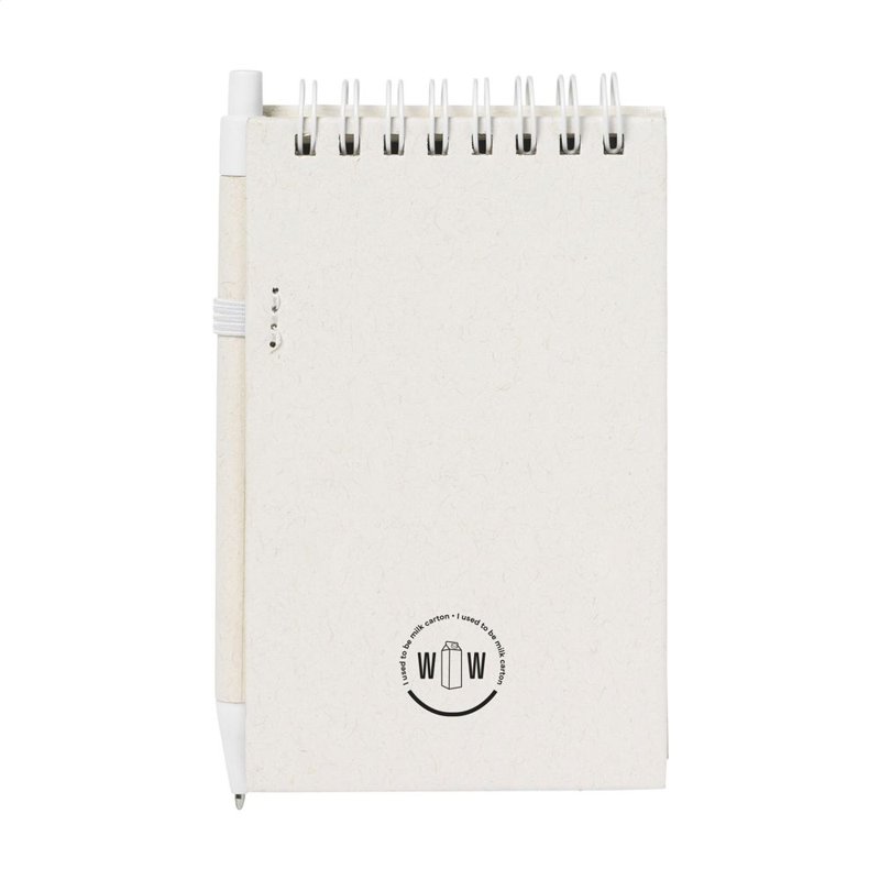 WoW! A6-notitieboekje waarvan zowel de cover als het papier gemaakt is van het overgebleven papier van gerecyclede melkpakken (tot 70%) en 30% gerecycled papier. Het notitieboekje is ringgebonden en heeft ca. 70 vel/140 pagina's crèmekleurig, gerecycled, gelinieerd papier (80 g/m²). Het wordt geleverd inclusief een bijpassende blauwschrijvende balpen, gemaakt van gerecyclede melkpakken.
