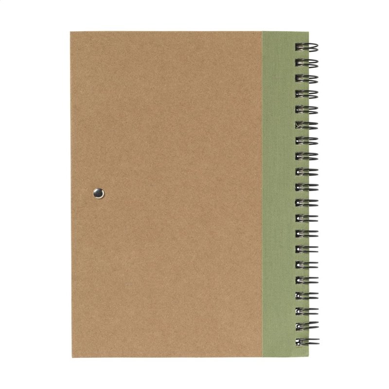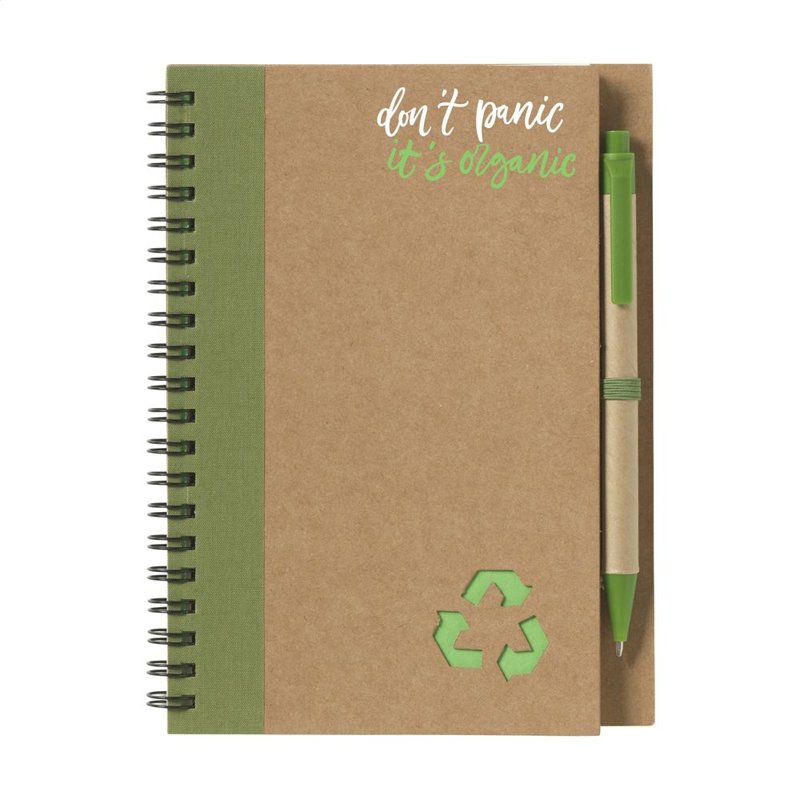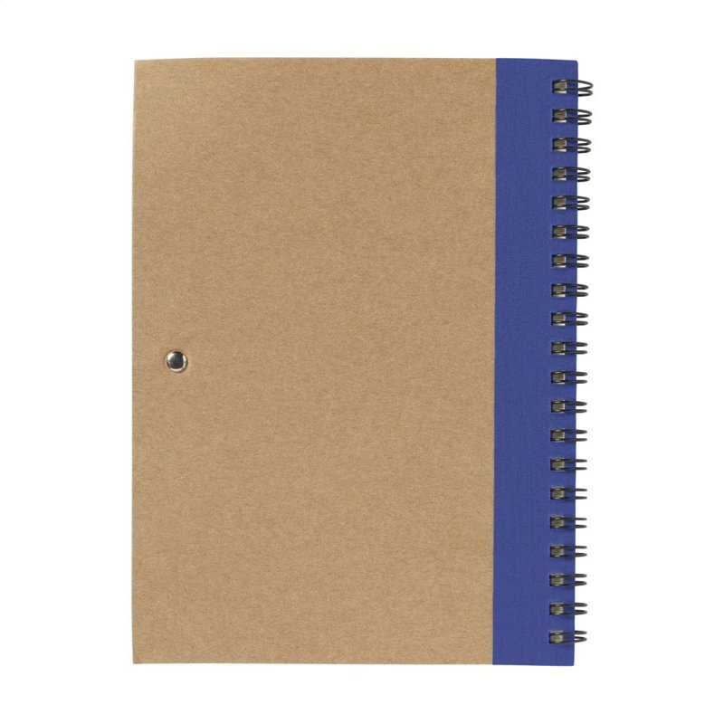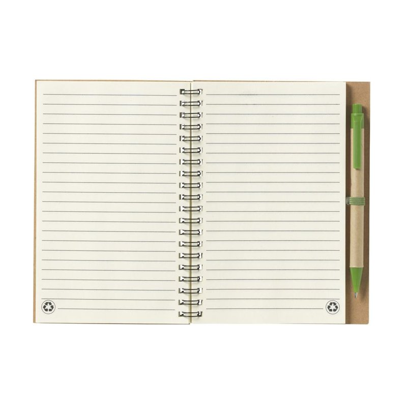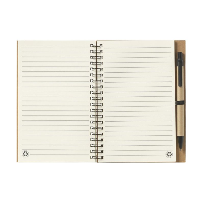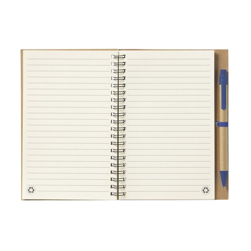 Milieuvriendelijk notitieboekje van gerecycled materiaal met ca. 70 vel/140 pagina's crèmekleurig, gelinieerd, FSC-gecertificeerd papier (70 g/m²), kartonnen omslag. Gebonden in een sterke, metalen wire-o-binding. Incl. blauwschrijvende balpen.