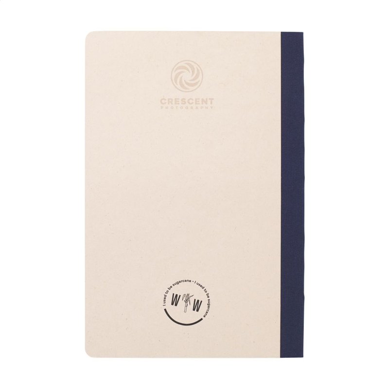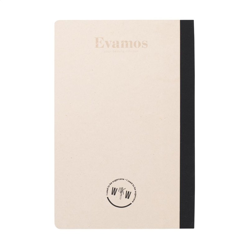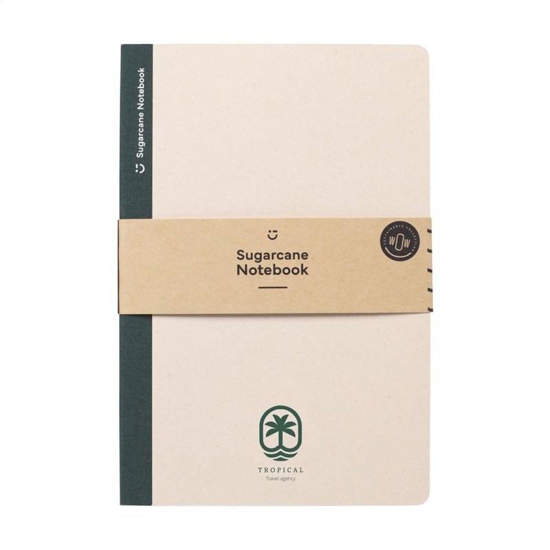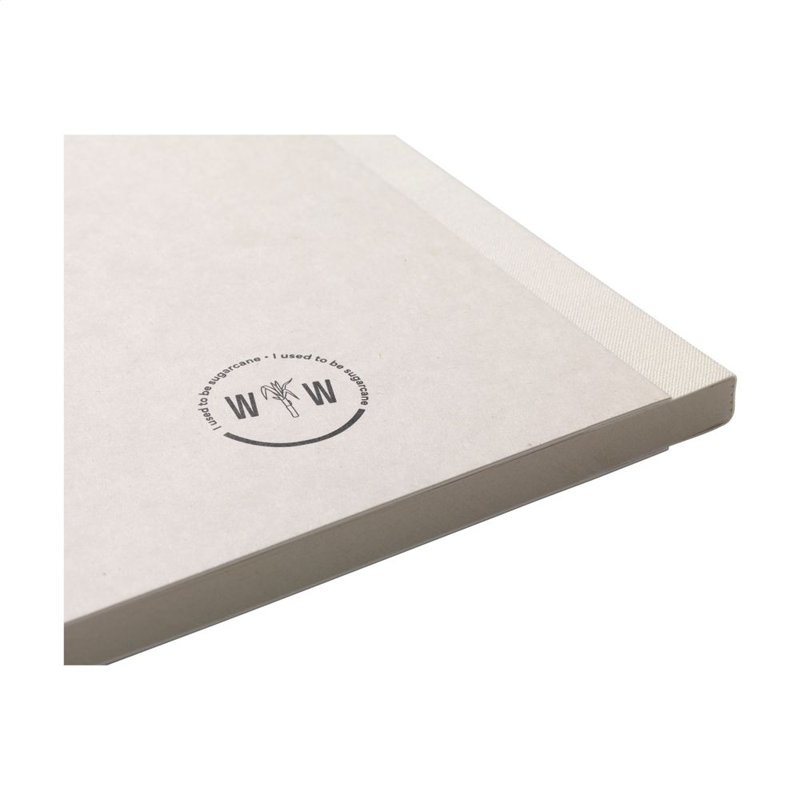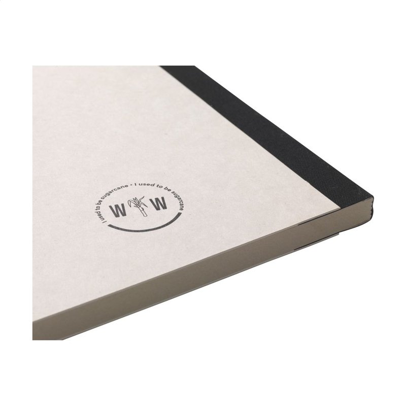 WoW! Exclusief notitieboekje in A5-formaat, gemaakt van het gerecycled afval van de suikerrietplant. Met hardcover en 80 vel/160 pagina's gelinieerd papier (100 g/m²). De hardcover en het papier zijn FSC® gecertificeerd. Het papier, waarin kleine vezels zichtbaar zijn, heeft een mooie lichtbruine kleur. Dit benadrukt het gebruik van natuurlijke materialen. Na de oogst van de suikerrietplant blijven de wortels van de plant in de grond en worden de stengels en bladeren verwerkt tot een residu dat gebruikt wordt voor het maken van papier. Een suikerrietplant haalt tijdens de groei CO2 uit de lucht en kan wel tot 10 jaar oud worden