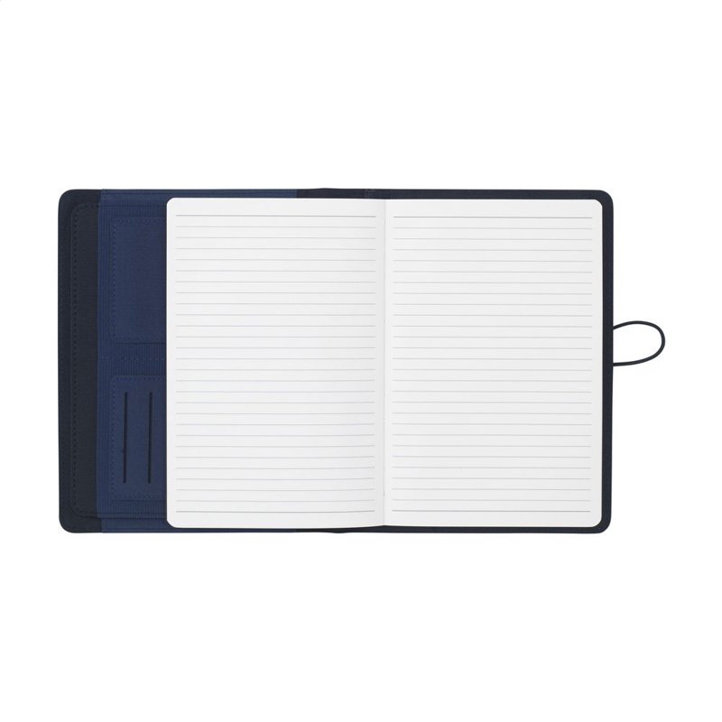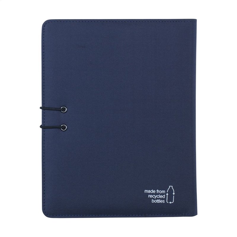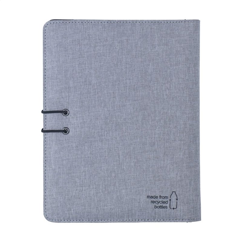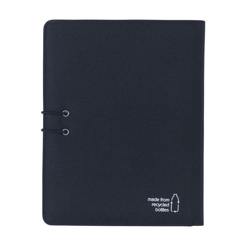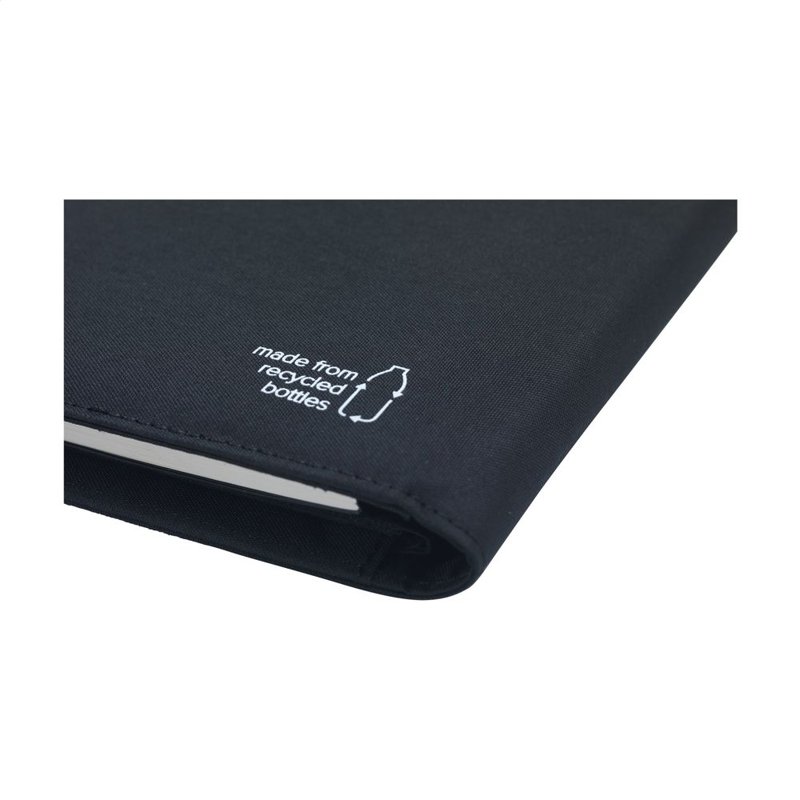 WoW! Moderne schrijfmap/documentenmap gemaakt van RPET-materiaal (gerecyclede PET-flessen). In A5-formaat. Voorzien van diverse insteekvakken, waaronder een apart vak voor het opbergen van een mobiele telefoon, 2 vakjes voor pasjes en een pennenlus. Inclusief notitieboek met ca. 64 vel FSC-gecertificeerd crèmekleurig, gelinieerd papier (70 g/m²). Een duurzaam en milieuvriendelijk product.