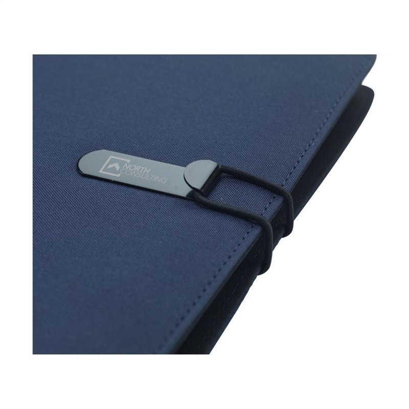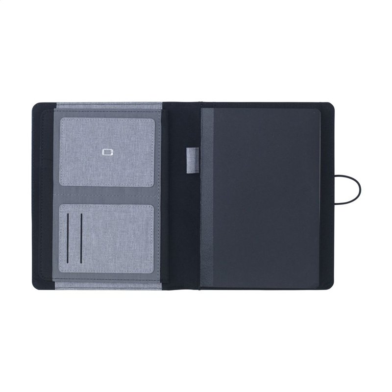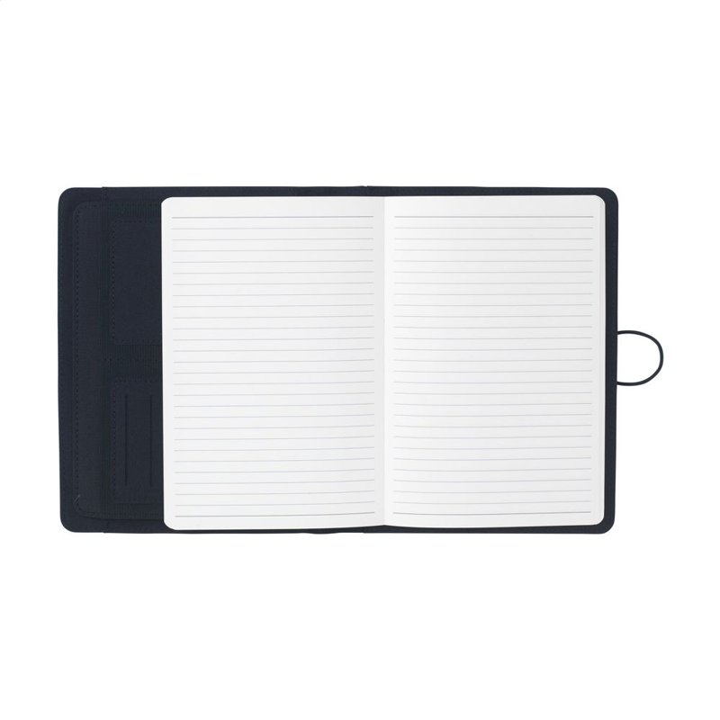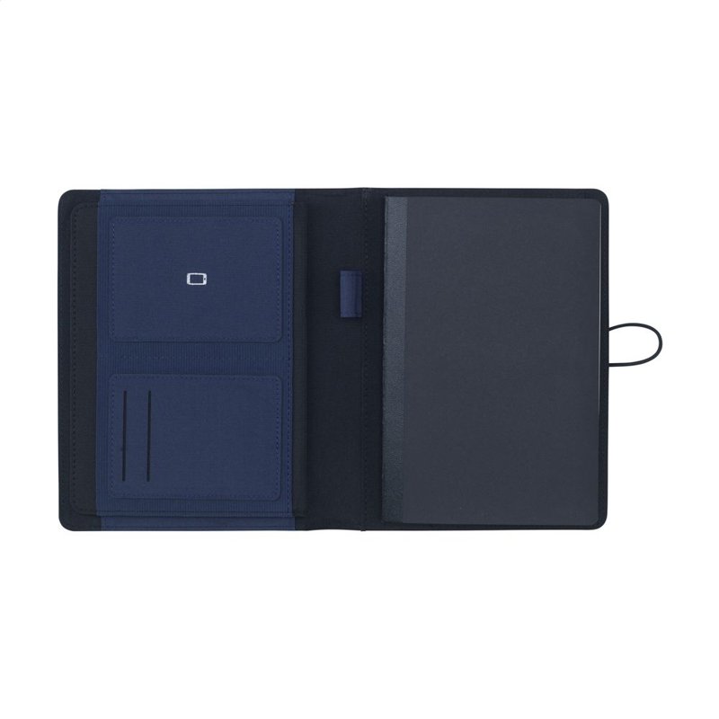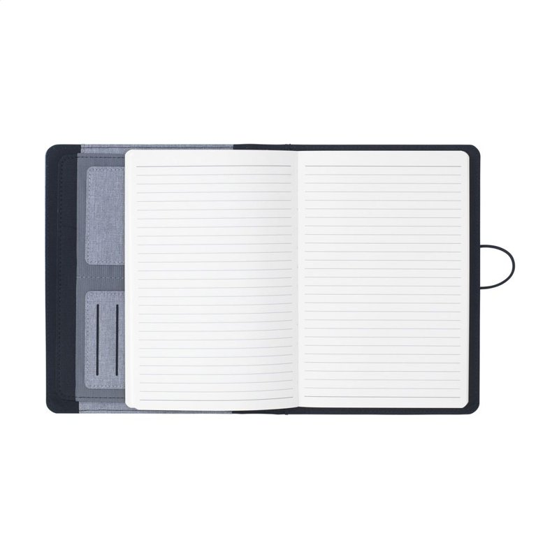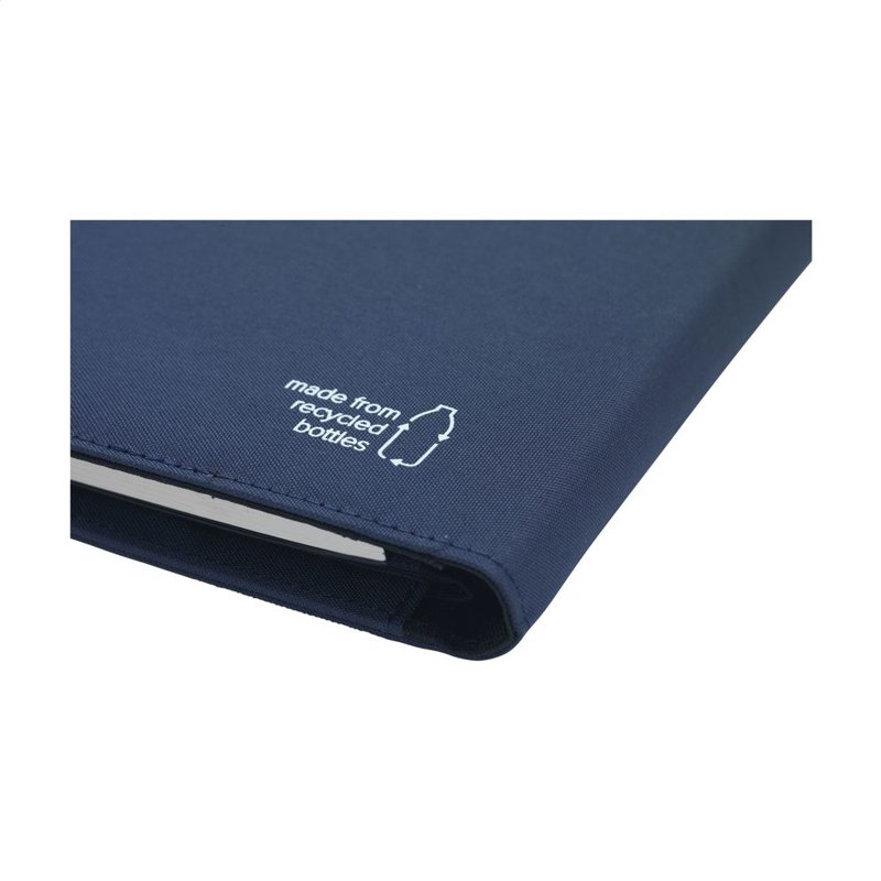 WoW! Moderne schrijfmap/documentenmap gemaakt van RPET-materiaal (gerecyclede PET-flessen). In A5-formaat. Voorzien van diverse insteekvakken, waaronder een apart vak voor het opbergen van een mobiele telefoon, 2 vakjes voor pasjes en een pennenlus. Inclusief notitieboek met ca. 64 vel FSC-gecertificeerd crèmekleurig, gelinieerd papier (70 g/m²). Een duurzaam en milieuvriendelijk product.