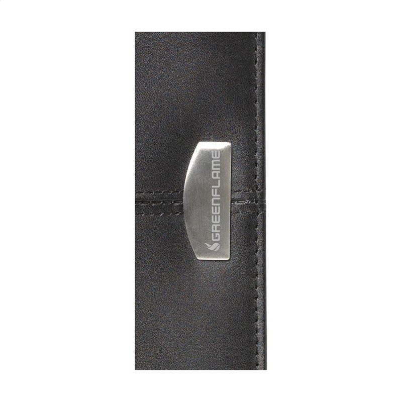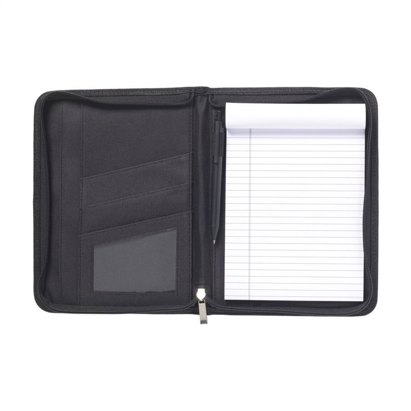 Schrijfmap/documentenmap van fijn gebonden leder, in A5-formaat. Met diverse insteekvakken en rits rondom. Incl. schrijfblok en balpen. Per stuk in kraft doos.