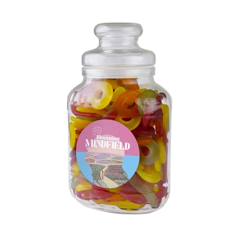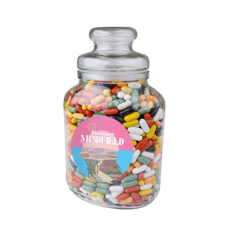 Nostalgische snoeppot voorzien van een full colour sticker op de voorzijde en gevuld met ca. 515 gram Strooigoed