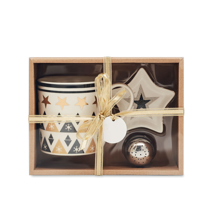 Keramische theeset met mok, theefilter en thee schoteltje. Verpakt in bijpassende kartonnen geschenkverpakking met lint en label.