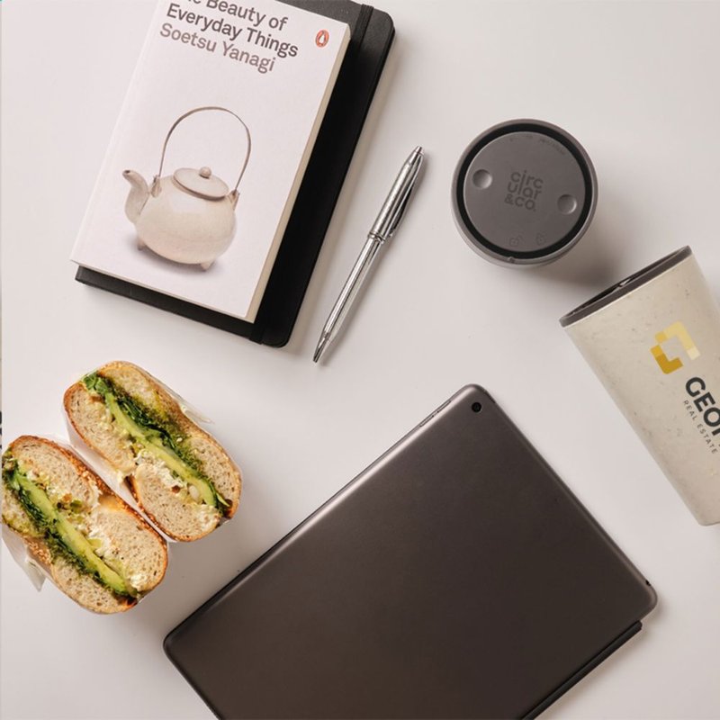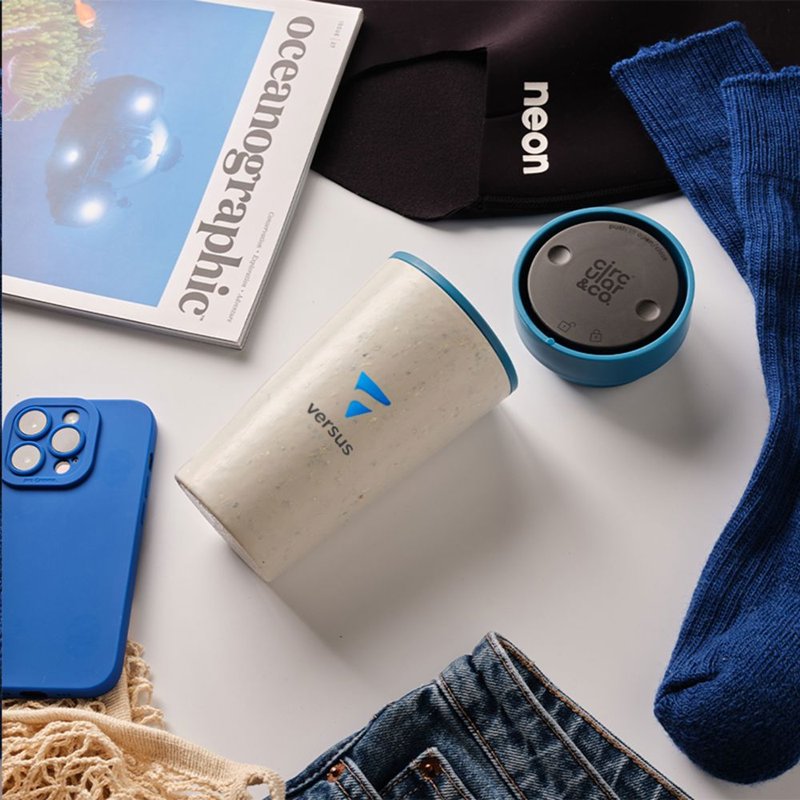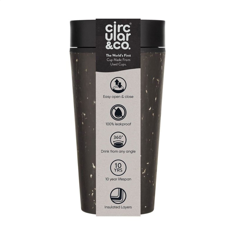 Dubbelwandige, circulaire herbruikbare koffie to-go beker met deksel van Circular&Co. De buitenste isolerende laag van deze beker is gemaakt van gebruikte gerecyclede single-use papieren koffiebekers. Met binnenwand en deksel van PP. 100% lekvrij. Door de isolerende werking blijft je warme drank langer warm en koude drank langer koel. Het deksel is ontworpen met gepatenteerde 360-graden technologie, waarmee je vanuit elke hoek kunt nippen. De koffiebeker kun je met één hand en één klik openen en sluiten. Ideaal voor onderweg. Food Safe, BPA-vrij en Melaminevrij. 100% recyclebaar. Inhoud 340 ml.