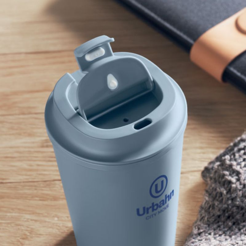 Dubbelwandige beker in PLA maïs met gerecycled PP drinkdeksel met TPR binnenkant. Inhoud: 350ml.