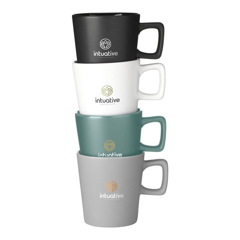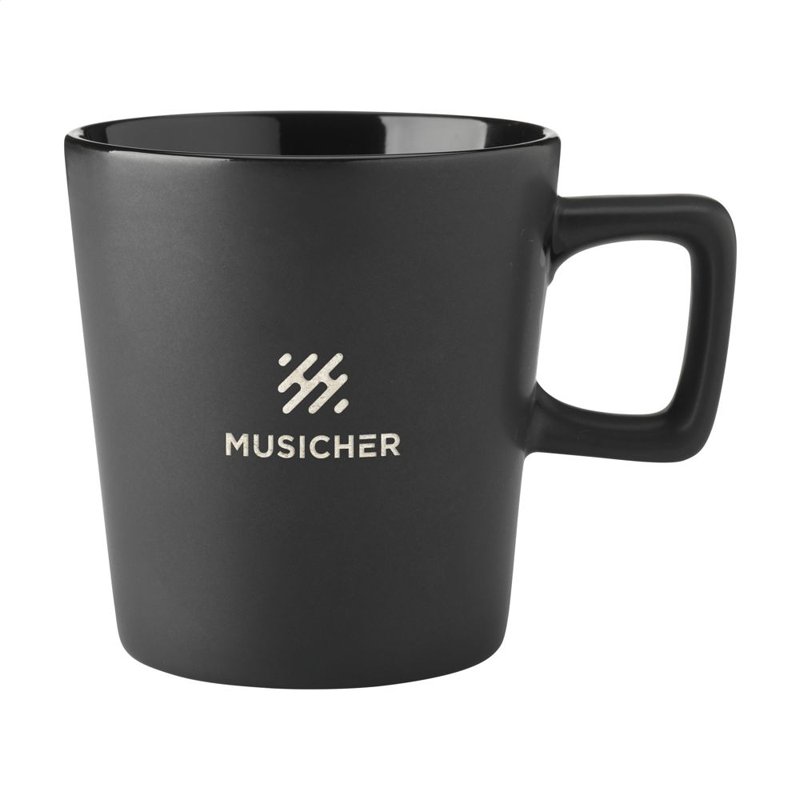 Moderne mok van hoogwaardig keramiek en 5% gerecycled keramiek. Het oor heeft een hoekige vorm en valt daardoor meteen op. De buitenzijde van de mok heeft een chique matte finish, de binnenzijde is afgewerkt in hoogglans. Vaatwasserbestendig. Inhoud 290 ml. Gerecyclede keramische mokken worden vervaardigd door grondstoffen te mengen met fragmenten van kapotte of onbruikbare mokken die in dezelfde fabriek zijn verzameld. Deze afgedankte componenten worden fijngemalen tot poeder en vervolgens gemengd met essentiële stoffen zoals kaolien en kwarts voordat ze worden omgezet in nieuwe keramische producten. Het uiteindelijke product bestaat doorgaans uit 5% tot 10% gerecycled keramiek om een optimale kwaliteit te garanderen. Het gebruik van gerecycled keramiek bevordert de circulaire economie en vermindert de behoefte aan nieuwe grondstoffen.
