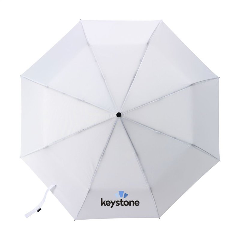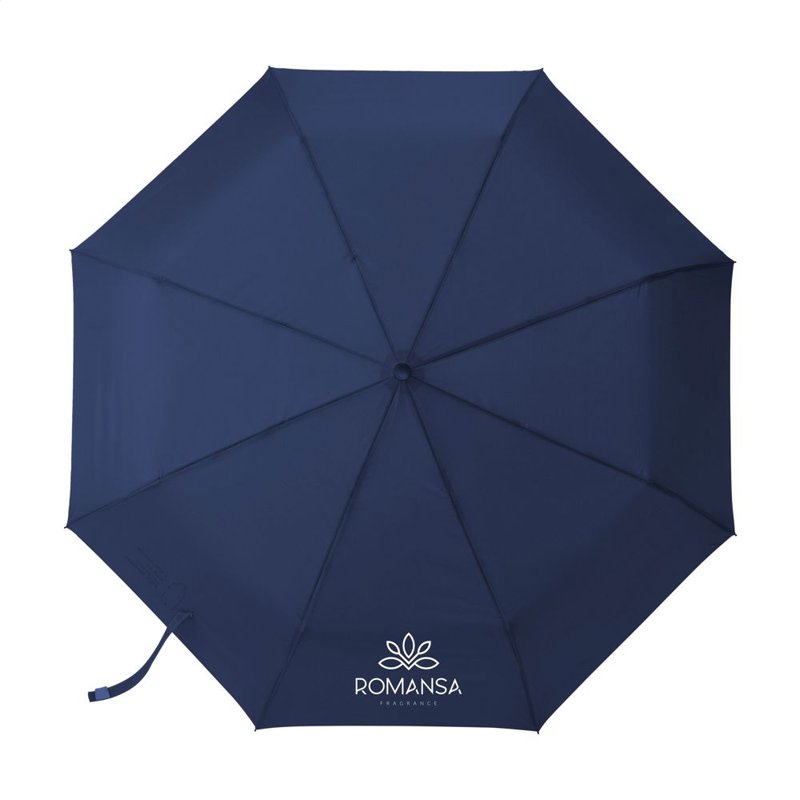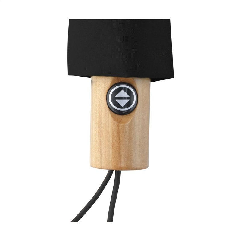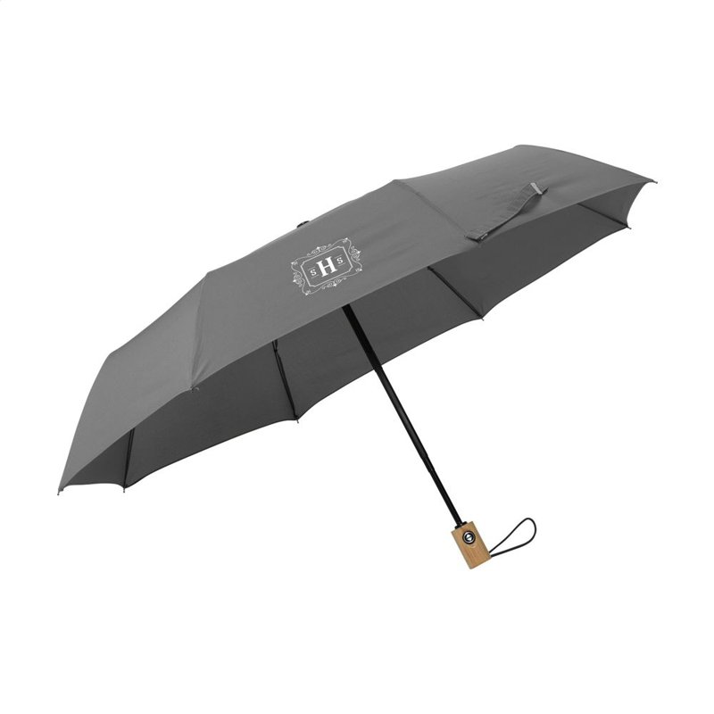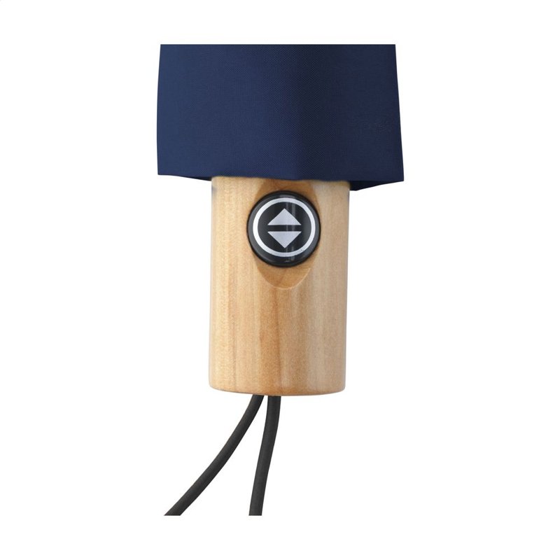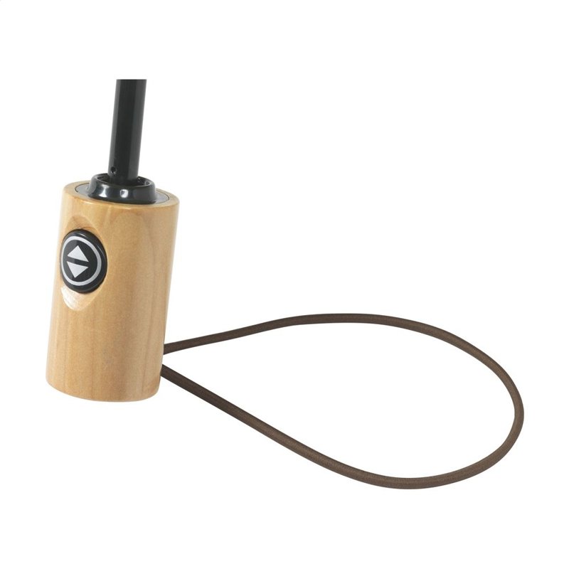 WoW! Opvouwbare paraplu met automatisch open- en sluitmechanisme. Met een RPET 190T pongee polyester bespanning (gemaakt van gerecyclede PET-flessen). Deze duurzame paraplu heeft een RVS frame en steel, houten handgreep, elastische lus en klittenbandsluiting. In opberghoes. Lengte ingevouwen: 28 cm.