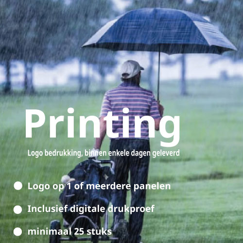 Je kunt je golfparaplu laten bedrukken van subtiel tot opvallend. Kies voor één paneel voor een rustige premium look, of meerdere panelen voor maximale merkimpact bij events en outdoor-locaties.
