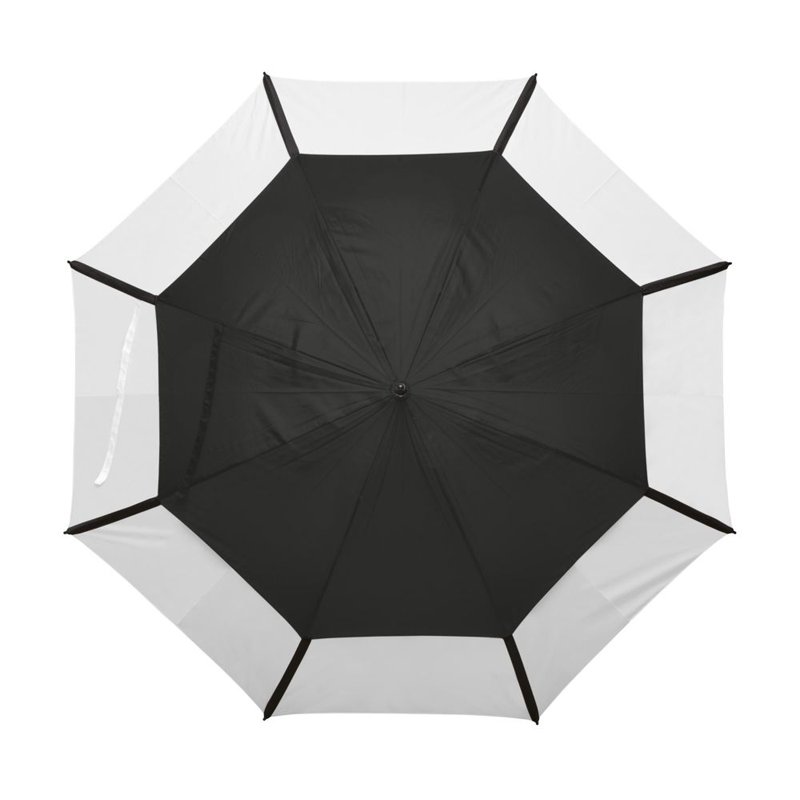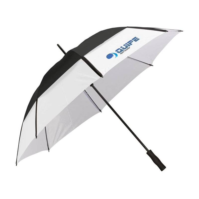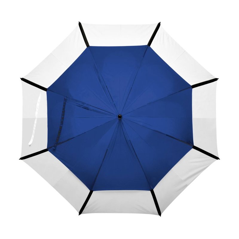 Luxe dubbellaags golfparaplu met 190 T polyester en 190 T nylon bespanning, stormfunctie, windbreker systeem, glasvezel frame, metalen steel, voorgevormde foam handgreep en dubbele klittenbandbandsluiting. In opberghoes.