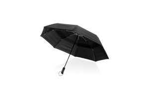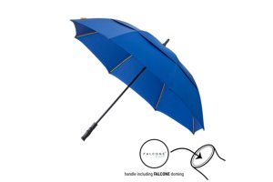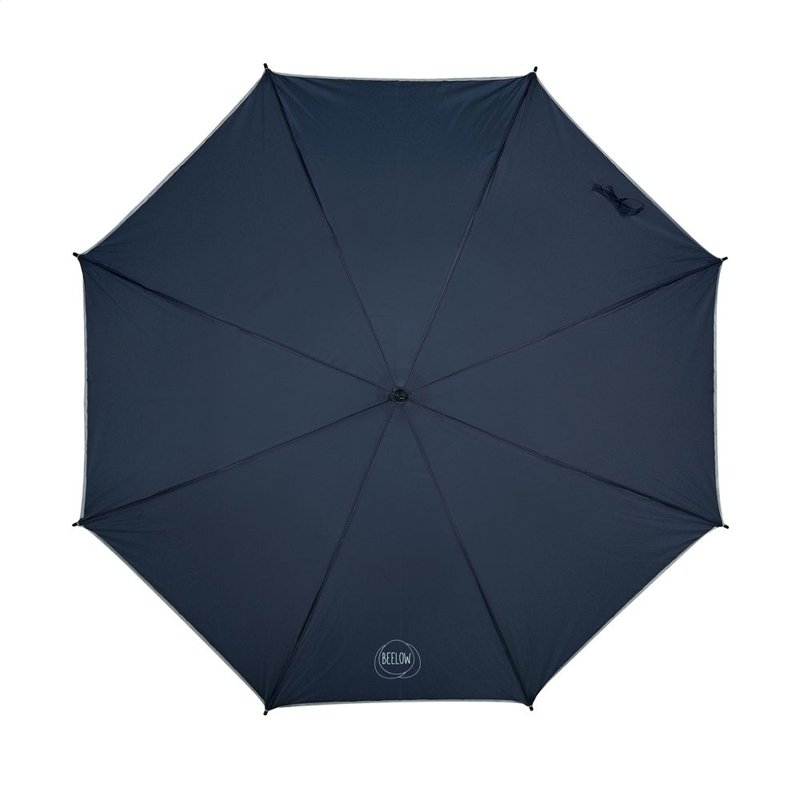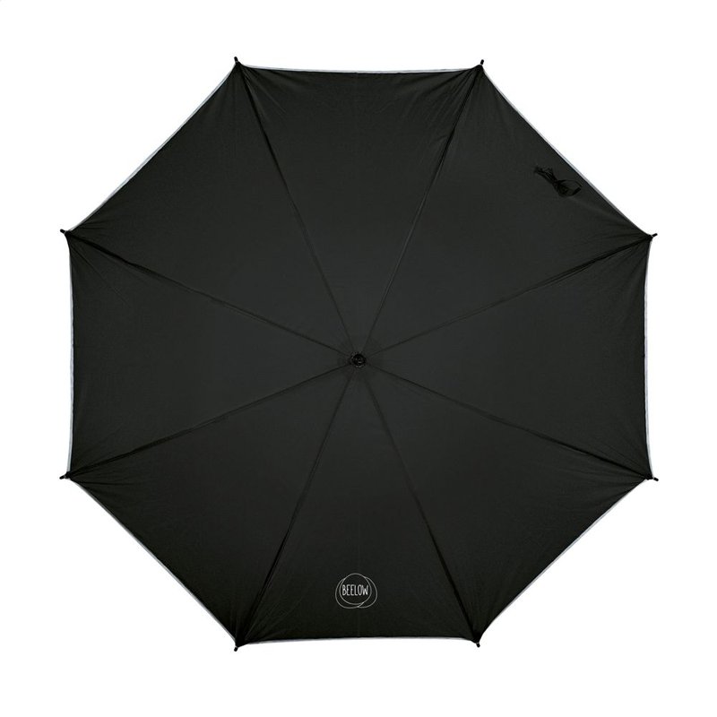 Lichtgewicht stormparaplu met reflecterende bies, 190T polyester bespanning, glasvezel frame, metalen steel, soft handgreep en klittenbandsluiting.