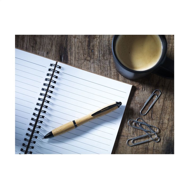 Blauwschrijvende, eco-vriendelijke bamboe pen met metalen clip en zilverkleurige accenten.