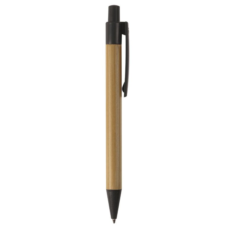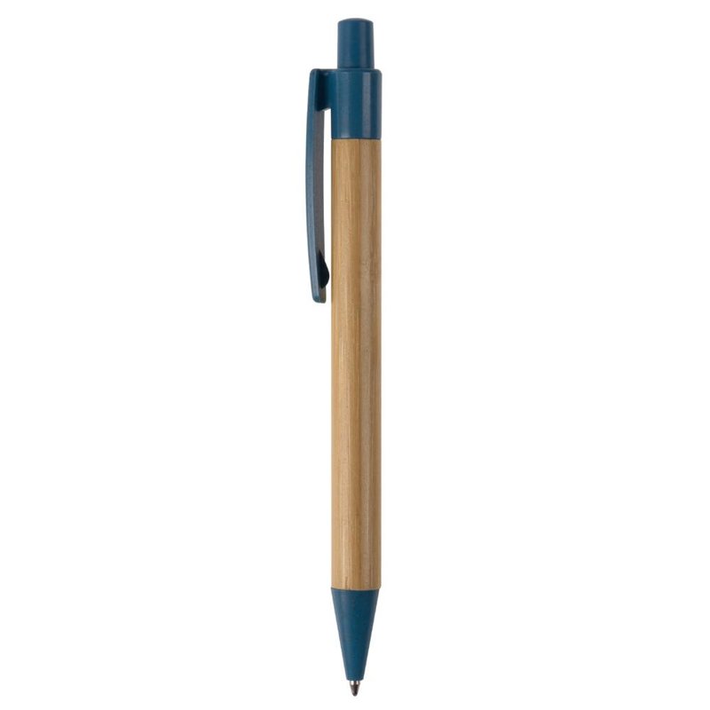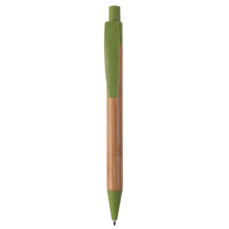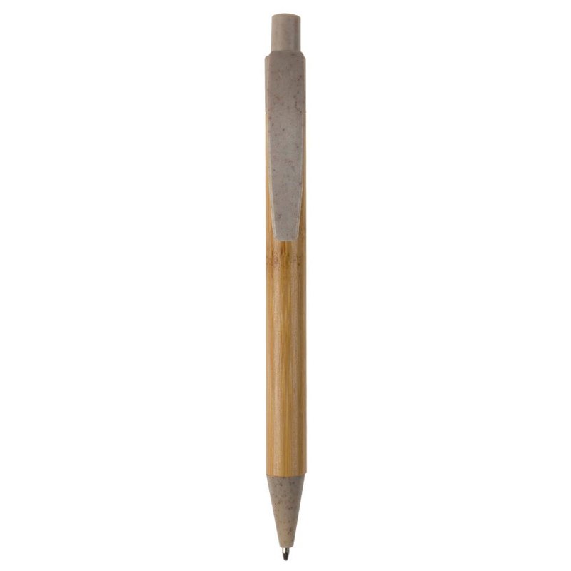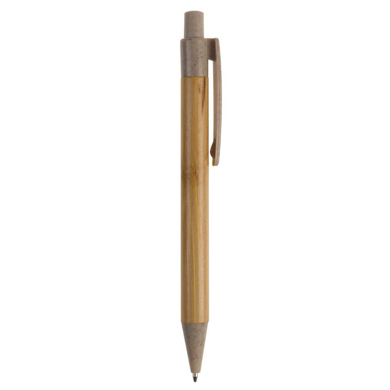 Balpen van bamboe materiaal met een clip, drukker en punt gemaakt van tarwestro. Bevat een kunststof blauwschrijvende X20 vulling.