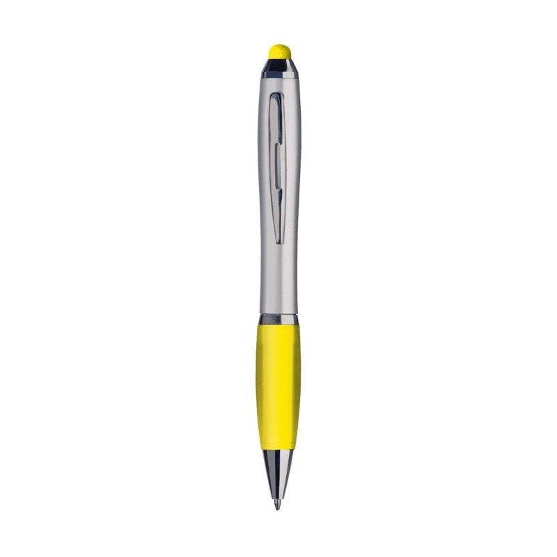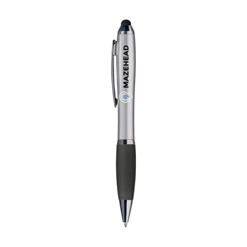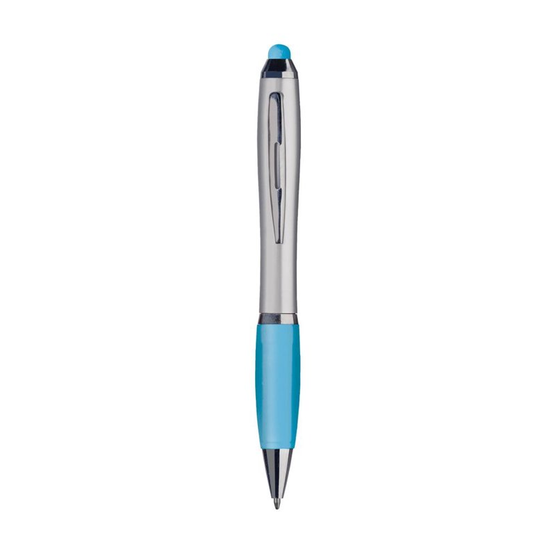Blauwschrijvende balpen met gekleurde, rubberen top/pointer voor het bedienen van touchscreens (zoals iPhone/iPad). Voorzien van hoogglans accenten, gekleurd, gripvast voorstuk, uitsparing in metalen clip en draaikliksysteem.
