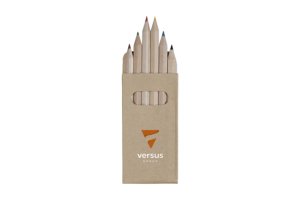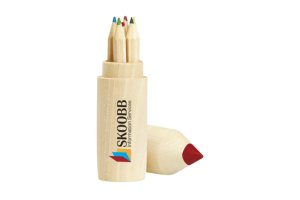 Kartonnen koker met 6 ongelakte kleurpotloden, 6 waskrijtjes en een puntenslijper. Formaat van de houten koker is 10 cm lang en een diameter van 4,5 cm