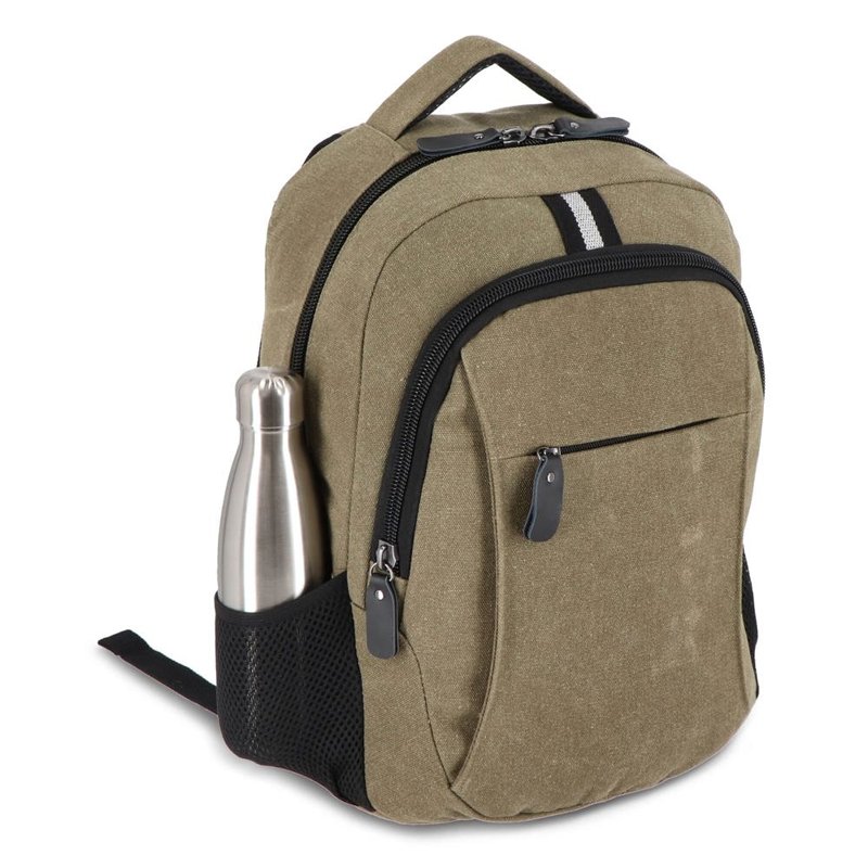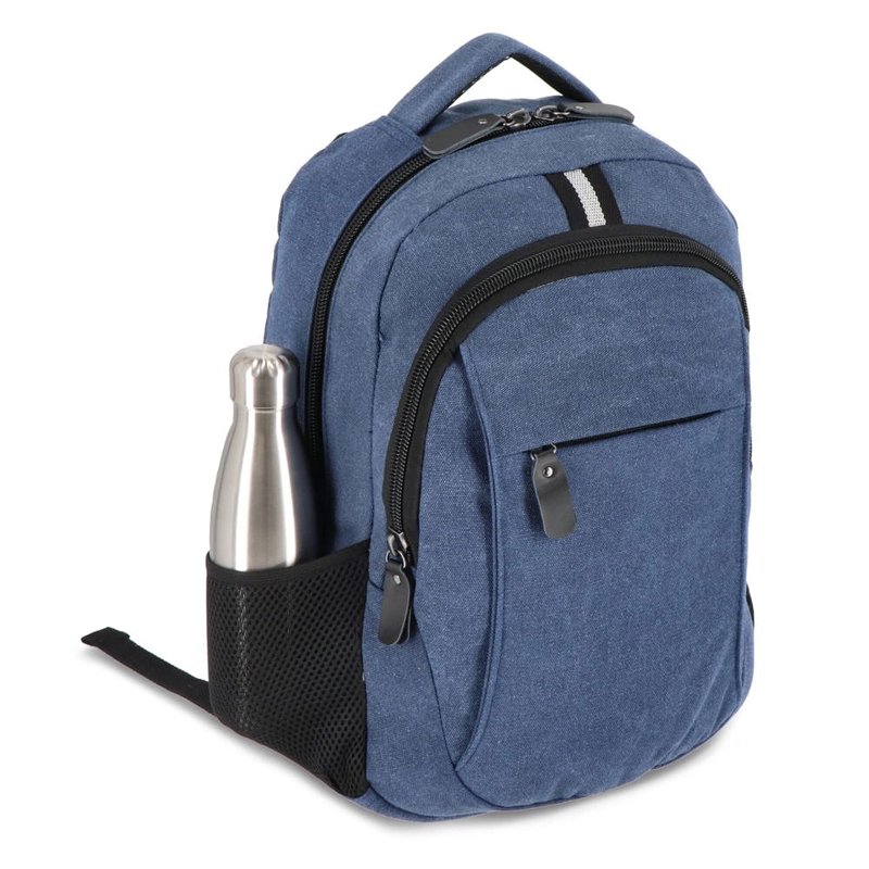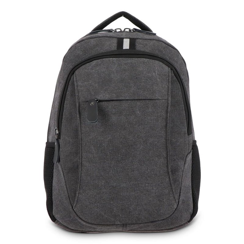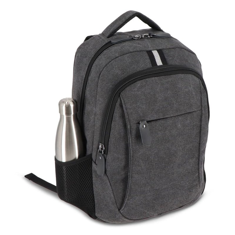 Stijlvolle rugzak van gerecycled katoenen canvas. Met 100% gerecyclede reflecterende banden, luxe ritsen en trekkers en 100% gerecyclede polyester voering. Met gewatteerde rug, handgreep, verstelbare schouderbanden, 2 zijvakken voor flessen of een paraplu, voorvak en laptopvak aan de binnenkant.