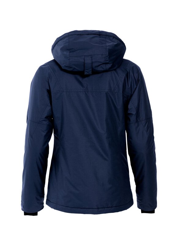 Dames padded jas. Wind- en waterproof. Vier zakken met rits, een binnenzak met rits en twee zakken in mesh uitvoering. Afneembare capuchon en verborgen boorden in mouwen. Handige doorvoer voor uw headset.