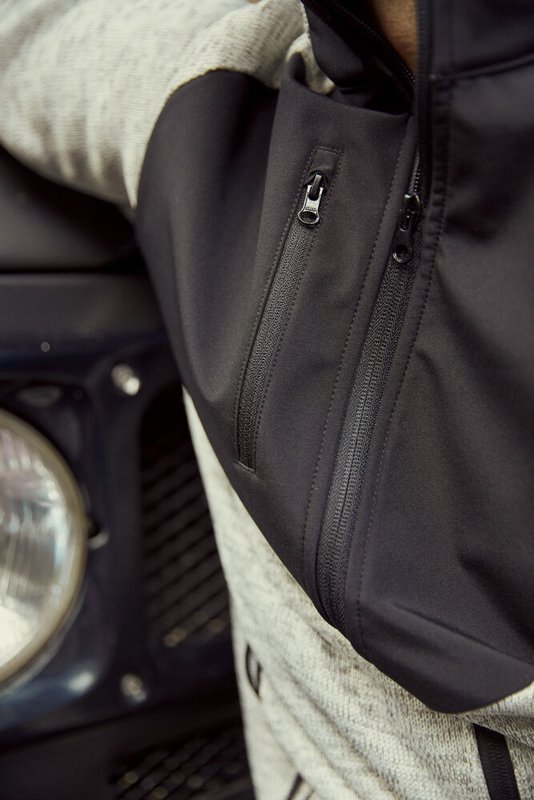 Een warm, gemakkelijk te dragen gebreid fleecejack met delen van softshell, drie zakken aan de buitenzijde met een ritssluiting en twee grote binnenzakken. De mouwen zijn afgewerkt met elastische manchetten met duimgaten en een opvouwbare reflecterende band. Voorzien van een eenvoudig te verwijderen label voor re-branding.<br />Materiaal: Shell 1 breisel: 100% polyester. Shell 2: 100% polyester.<br />Kwaliteit: 280 g/m²<br />Geslacht: men