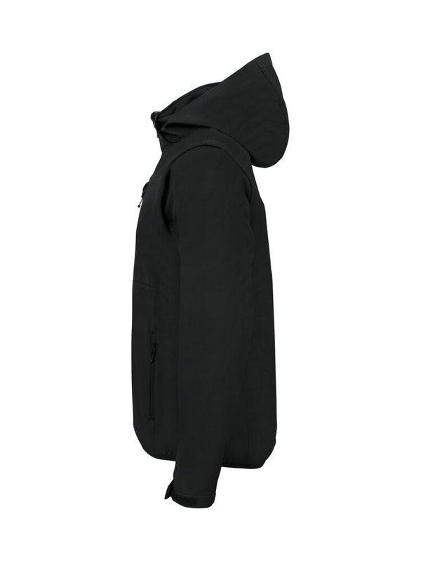 Unisex 3-laags softshell jas én vest in één! Gemaakt van gerecycled polyester met zachte fleece binnenkant. Afneembare mouwen en capuchon maken het eenvoudig om van jas naar vest te wisselen. Voorzien van SBS-ritsen in contrasterend kleur, twee steekzakken met rits en één borstzak met rits. Afgewerkt met elastische band bij de boord en klittenbandverstelling op de mouwen voor een perfecte pasvorm. Eenvoudig te rebranden dankzij het verwijderbare label.