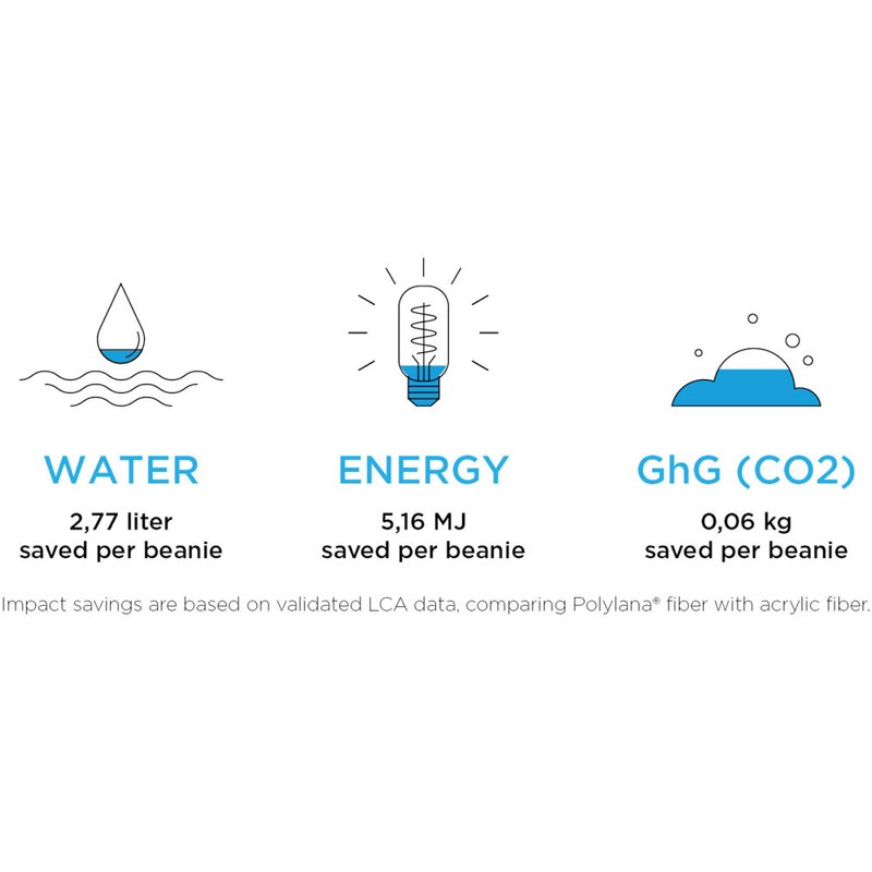 In vergelijking met acrylvezel levert elke muts van Polylana® de volgende besparing op: 2,77 liter water, 5,16 MJ energie en 0,06 kg GhG (CO2). De besparingen zijn gebaseerd op gevalideerde gegevens van de levenscyclusanalyse (LCA). 1x1 Rib knit van 60% Polylana® vezel en 40% Acryl, 12 gauge.