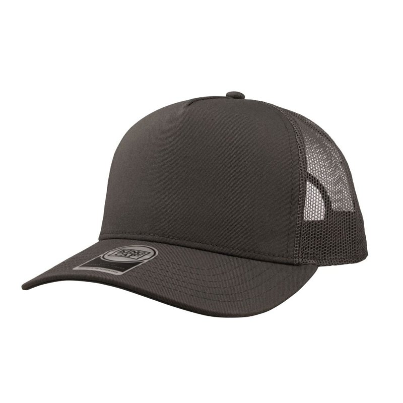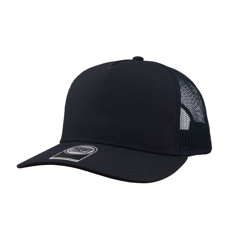 5 panel trucker cap met frontvoering. American profile. Kunststof druksluiting. Uitgevoerd in gerecycled katoen met gerecycled mesh