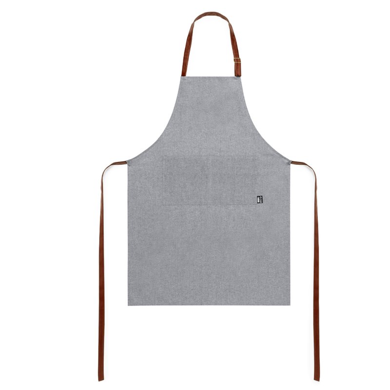 Schort uit de natuurlijn van RPET-materiaal, gemaakt van gerecycled plastic, om het hergebruik van plastic afval te bevorderen en de duurzaamheid van de planeet te bevorderen. Getailleerd onder de knie, met verstelbare bandjes van resistent PU-leer en een groot voorvak. Label op zak met RPET-logo. Schort Hanaku 1715
