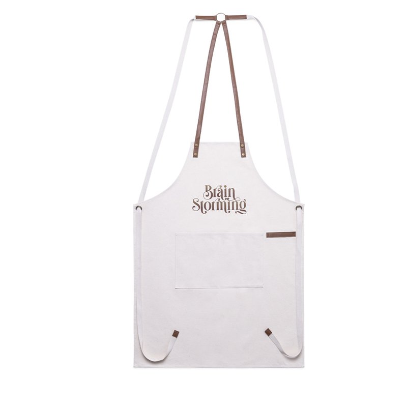Hoogwaardig schort van resistent canvas van 100% katoen, 340 g/m2, met versterkte naden. Gesneden onder de knie, met resistente PU-leren banden en drievoudige aanpassing: nek, rug en taille. Met voorvak, accessoire van PU-leer en metalen klinknagels voor versteviging. Schort Yorrent 1714