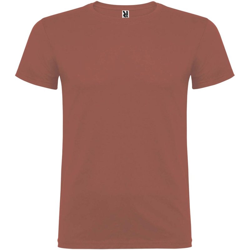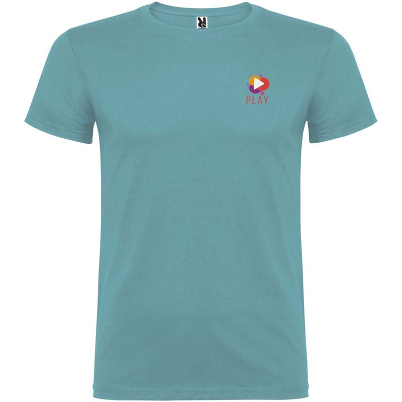 Een T-shirt met korte mouwen en een dubbellaagse ronde hals, gemaakt van elastische buisvormige stof. De kraag is voorzien van versterkte bedekte naden voor extra duurzaamheid. Het etiket is eenvoudig te verwijderen. Het model op de afbeelding is 120 cm lang en draagt maat 5/6.