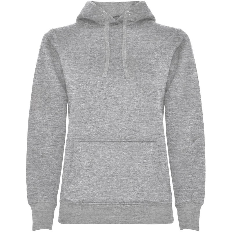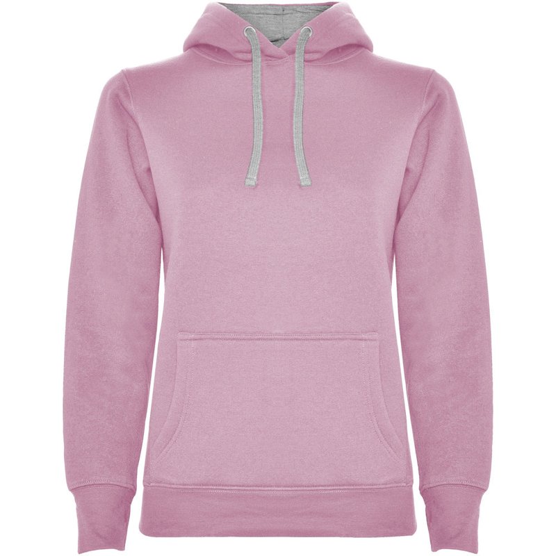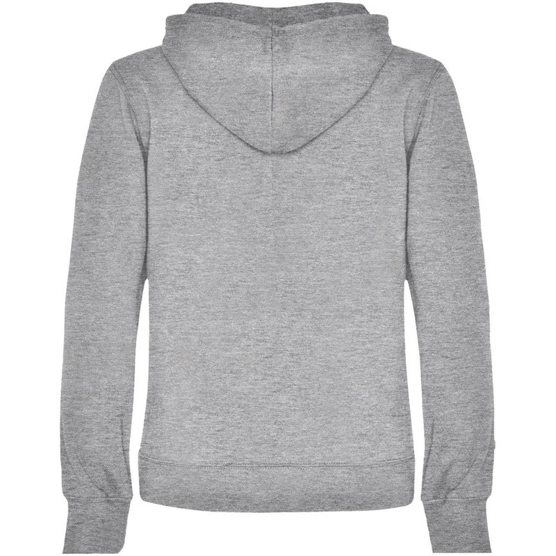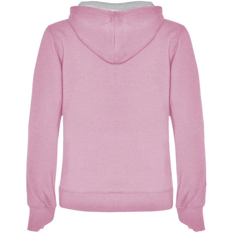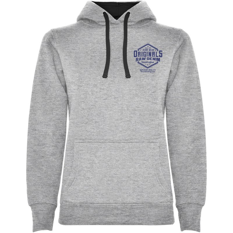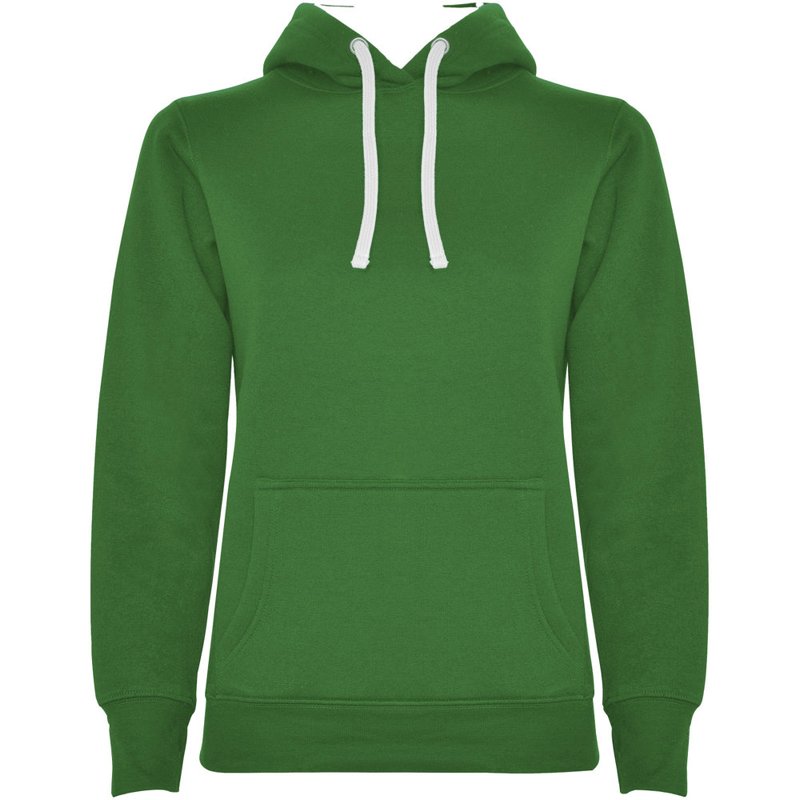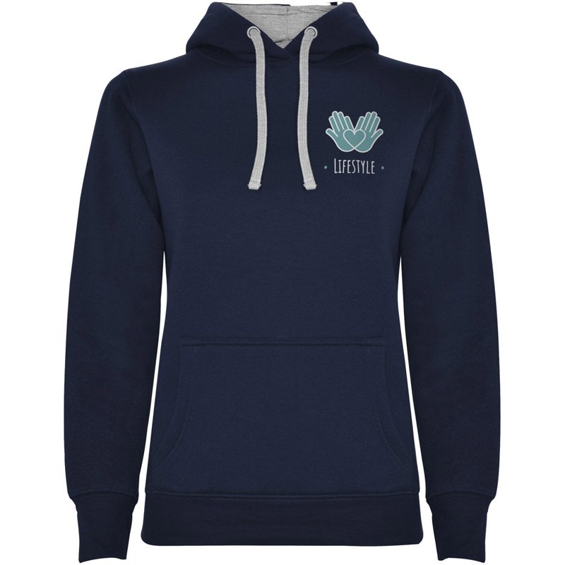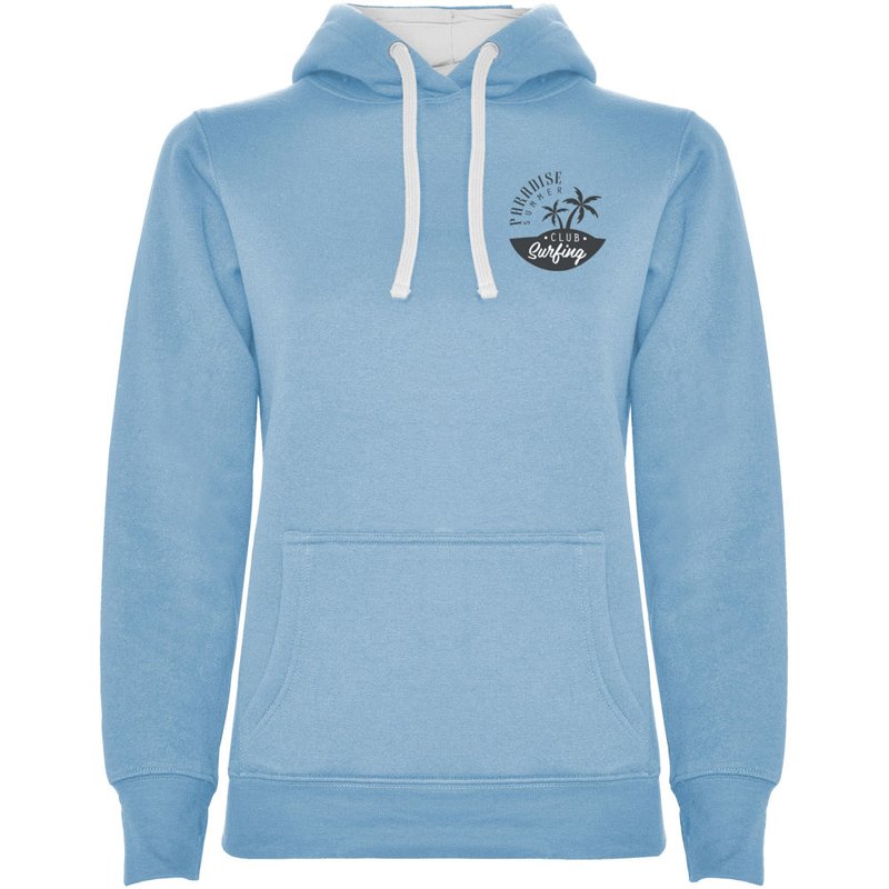Een vrouwelijk en getailleerd sweatshirt met een stijlvolle tweekleurige capuchon van dubbele stof. Het sweatshirt heeft een contrasterend verstelbaar trekkoord voor een persoonlijke pasvorm en een trendy uitstraling. De kraag is voorzien van bedekte naden voor een nette afwerking en duurzaamheid. Daarnaast is er een praktische kangoeroezak aanwezig om je handen warm te houden of kleine spullen in op te bergen. De manchetten en zoom zijn gemaakt van 1x1 elastaan rib, wat zorgt voor een comfortabele pasvorm en vormbehoud. Een speciaal detail is het duimsplitdetail, waardoor je je duimen kunt steken voor extra warmte en een moderne look. Het etiket is eenvoudig te verwijderen voor extra comfort. Het model op de afbeelding is 179 cm lang en draagt maat S.