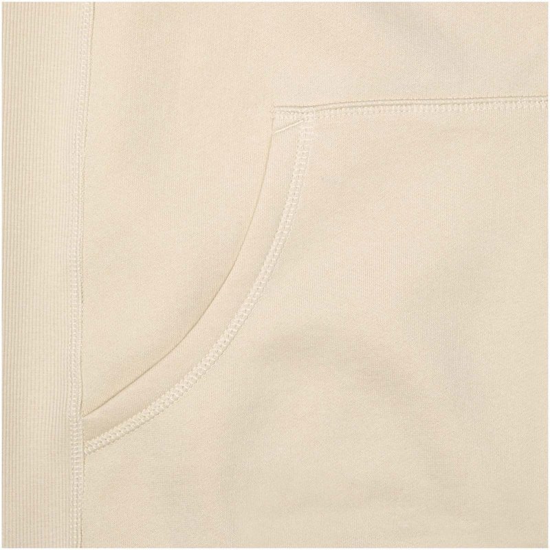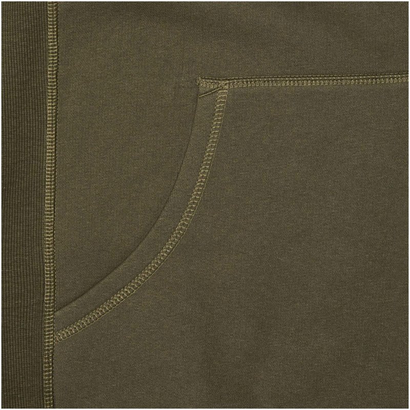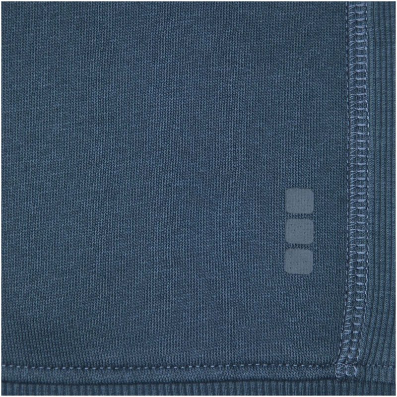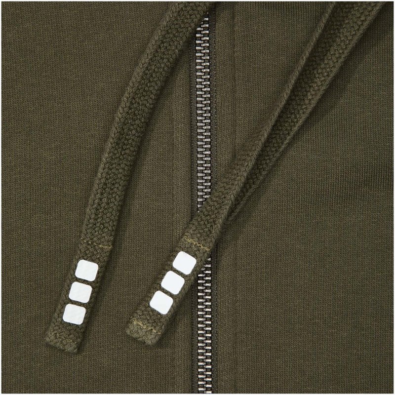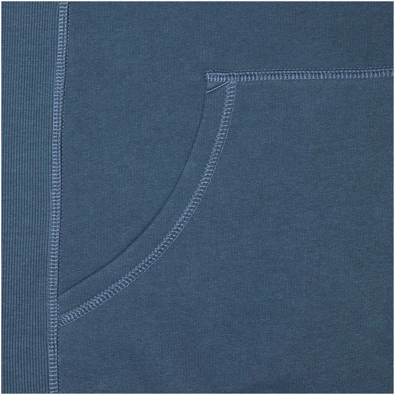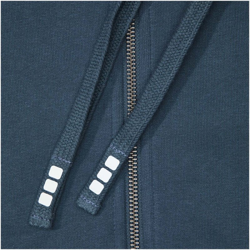 Ribgebreide zijpanelen. Plat gebreide rib mouw. Ribgebreide onderzijde. Trekkoord in capuchon. Kangoeroezak. Halve maan. Single jersey voering aan binnenkant capuchon. Gegraveerde zilveren oogjes. Satijnen nektape. contrast gekleurde visgraat tape.