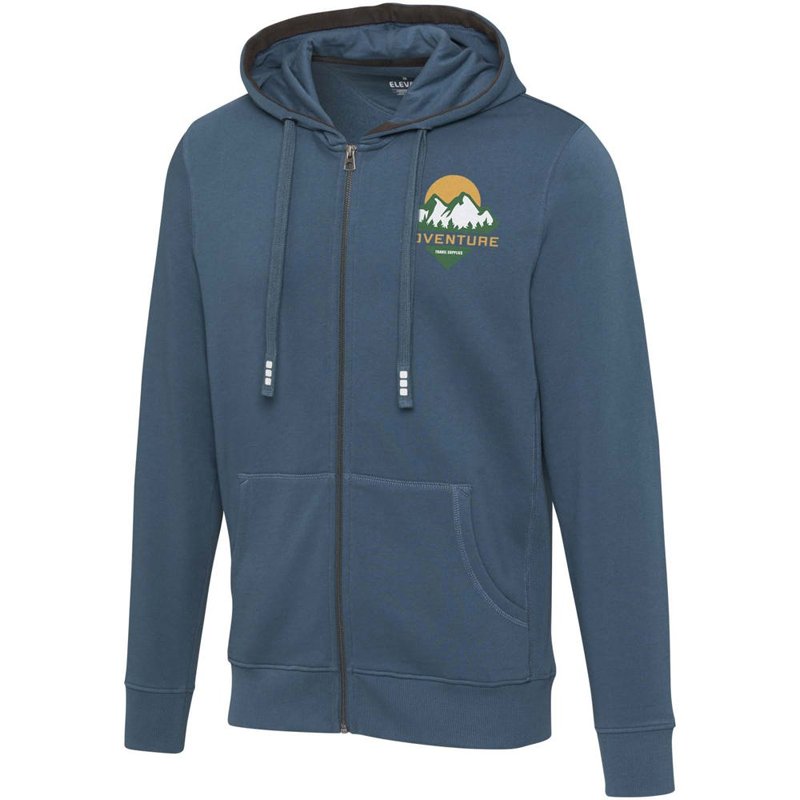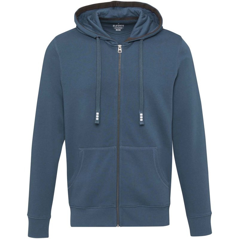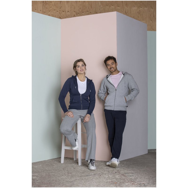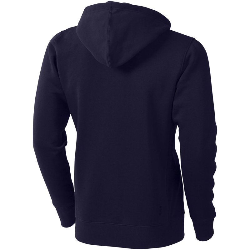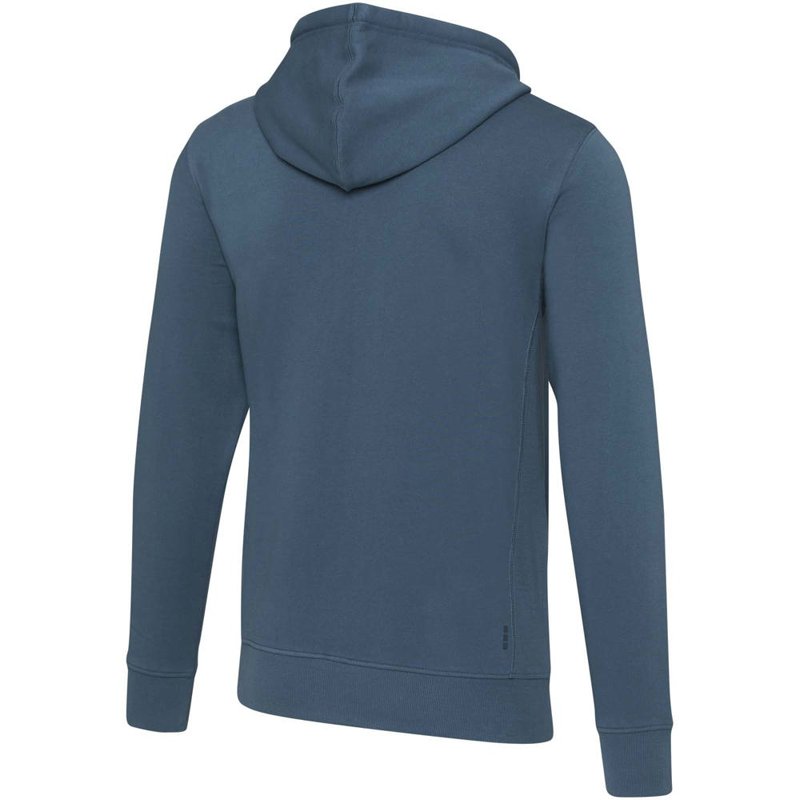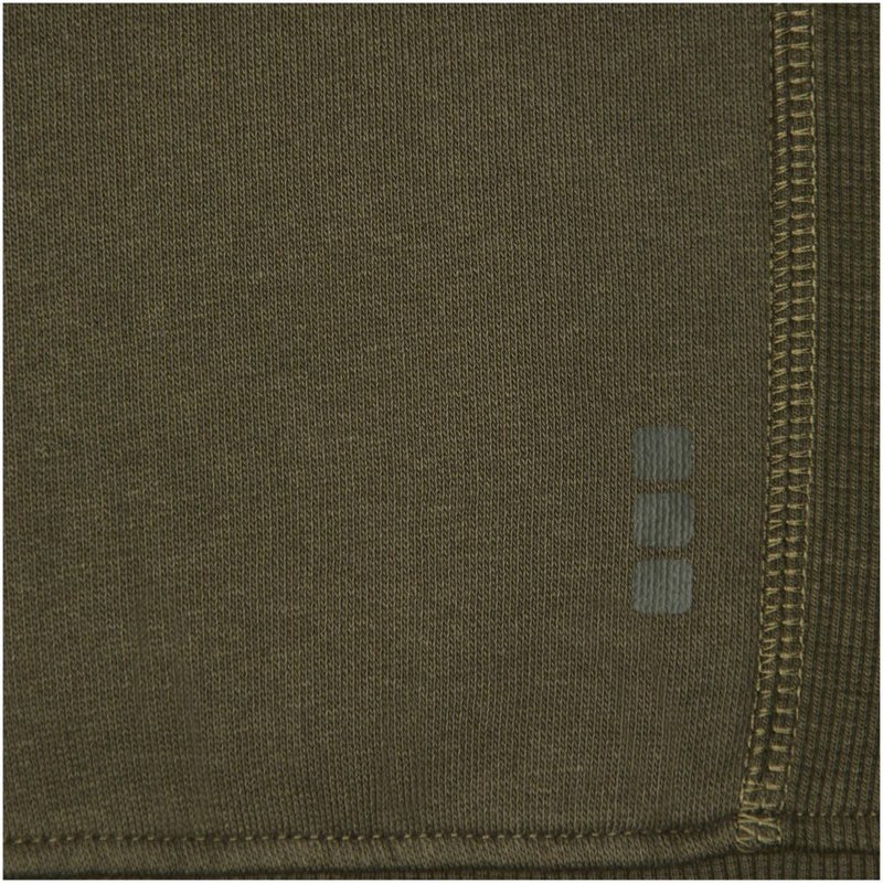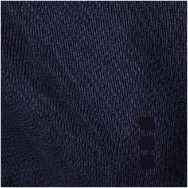 Ribgebreide zijpanelen. Plat gebreide rib mouw. Ribgebreide onderzijde. Trekkoord in capuchon. Kangoeroezak. Halve maan. Single jersey voering aan binnenkant capuchon. Gegraveerde zilveren oogjes. Satijnen nektape. contrast gekleurde visgraat tape.